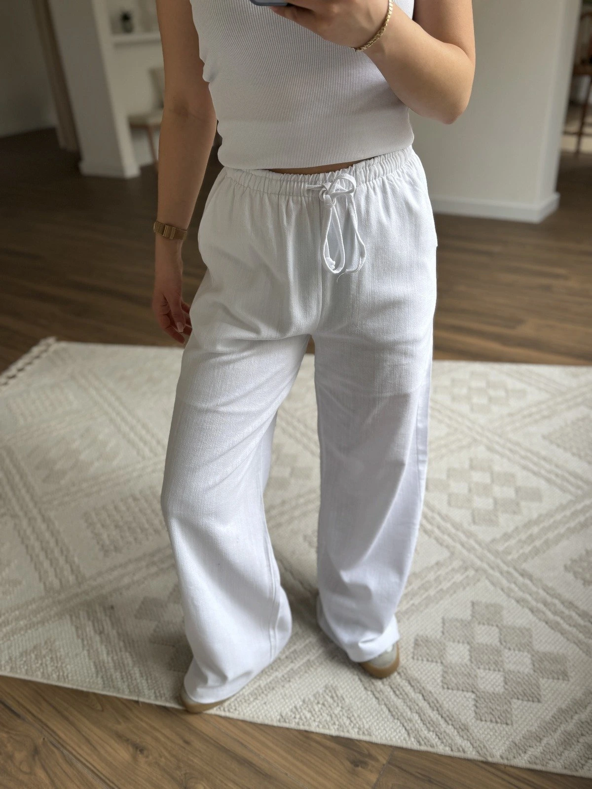 ARKA BEL LASTİK BOL PAÇA KETEN VİSKON PANTOLON – BEYAZ