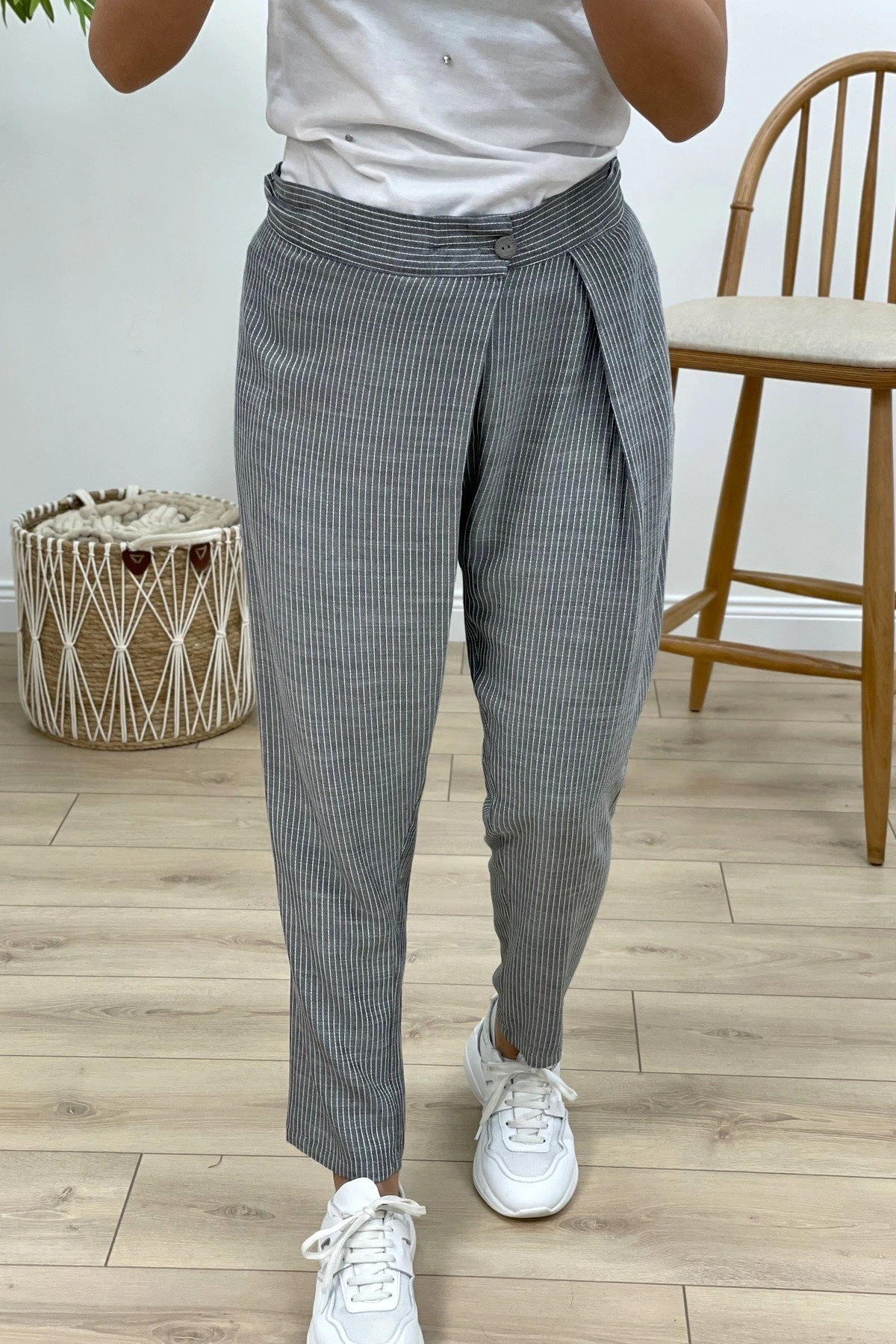 BEL LASTİK VE FERMUARLI KETEN PANTOLON – GRİ