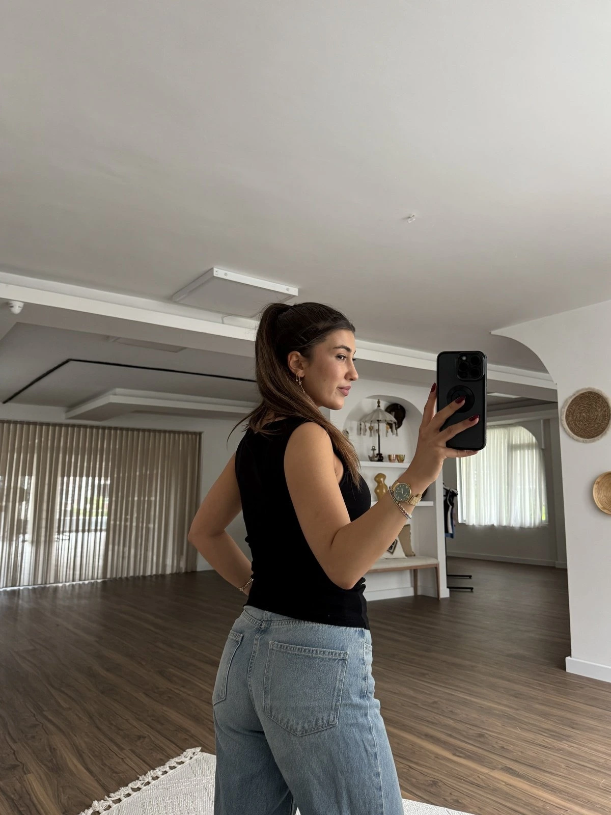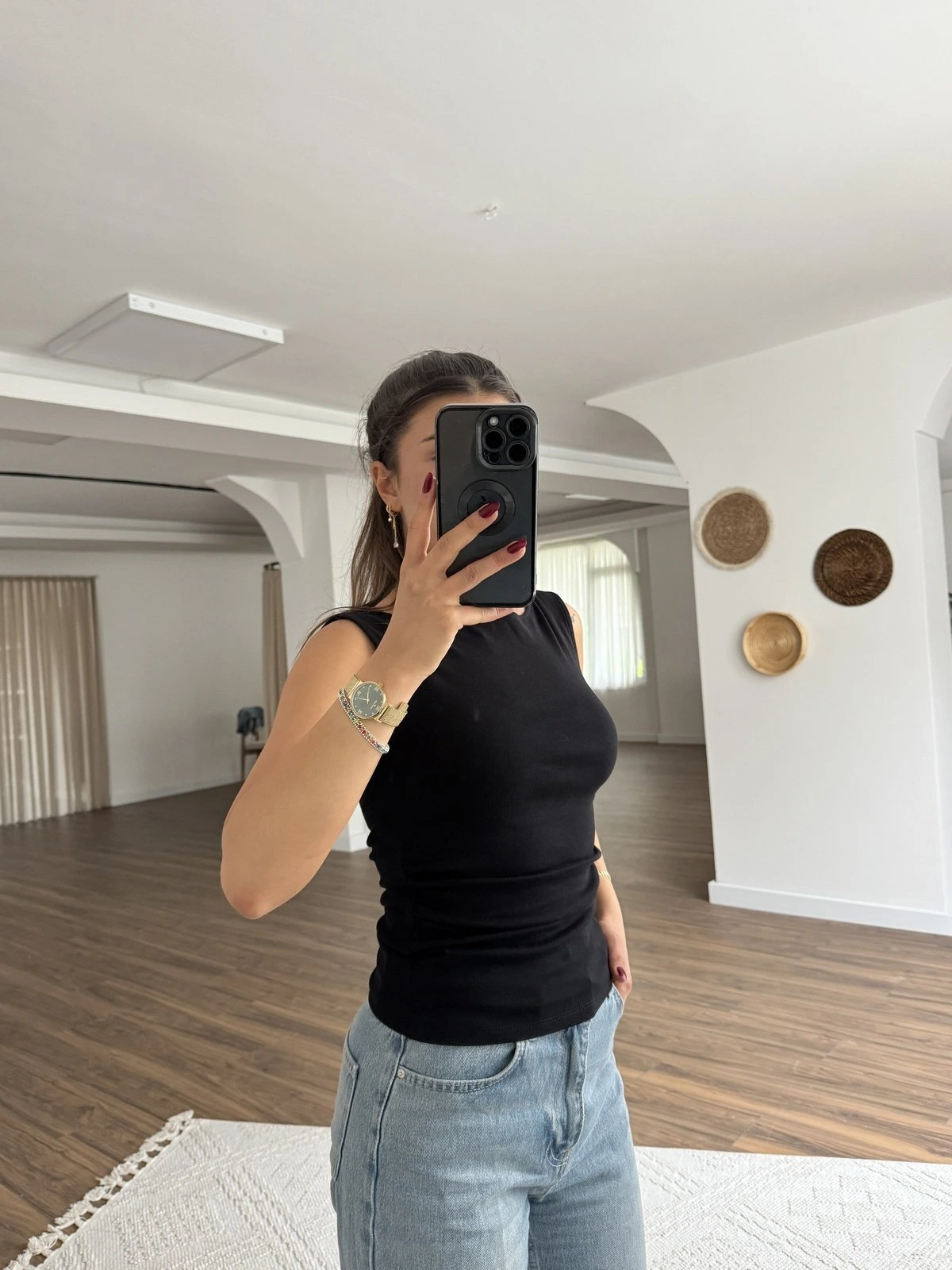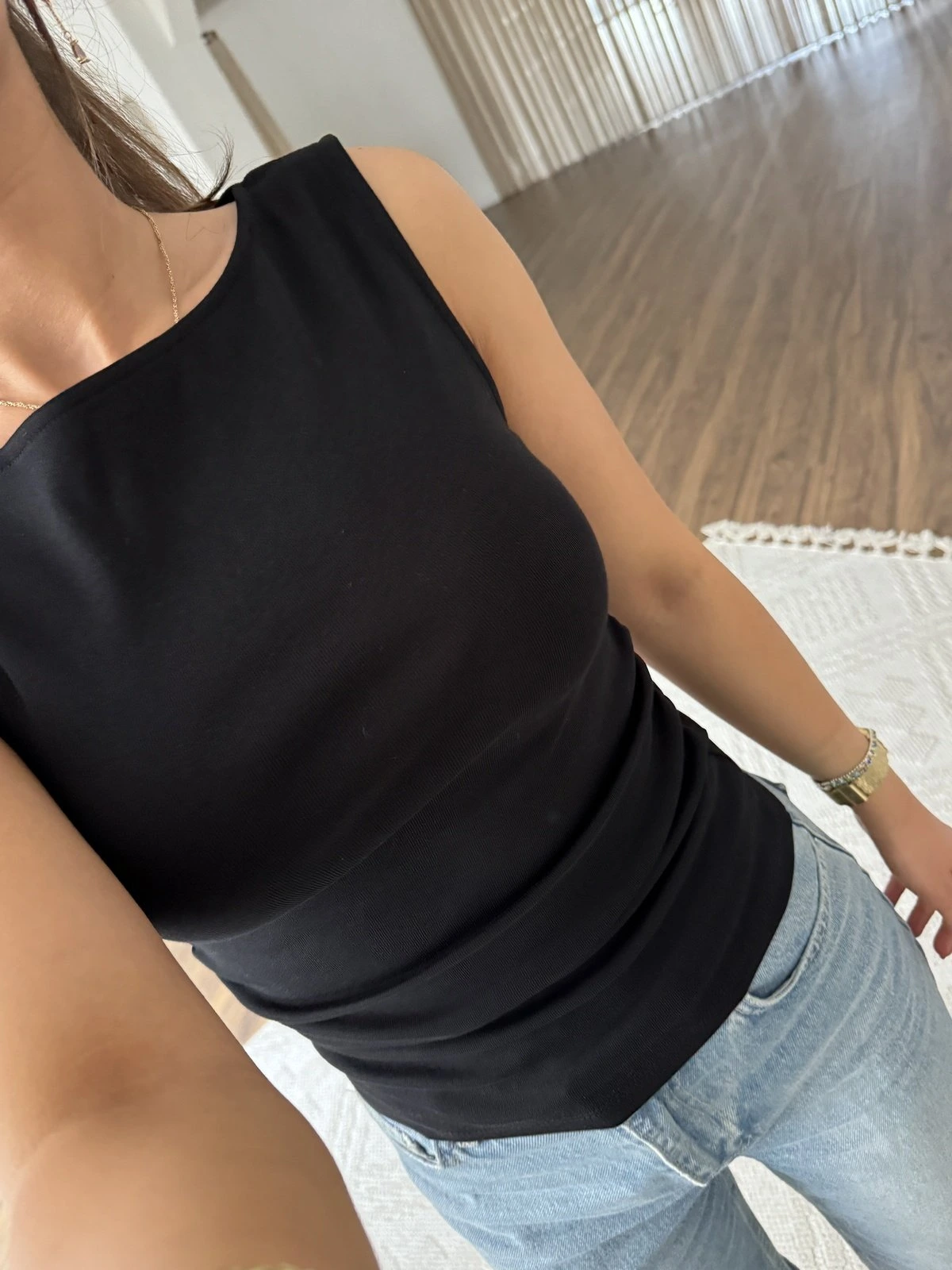 KAYIK YAKA YAN BÜZGÜ PAMUK LİKRALI ATLET – SİYAH