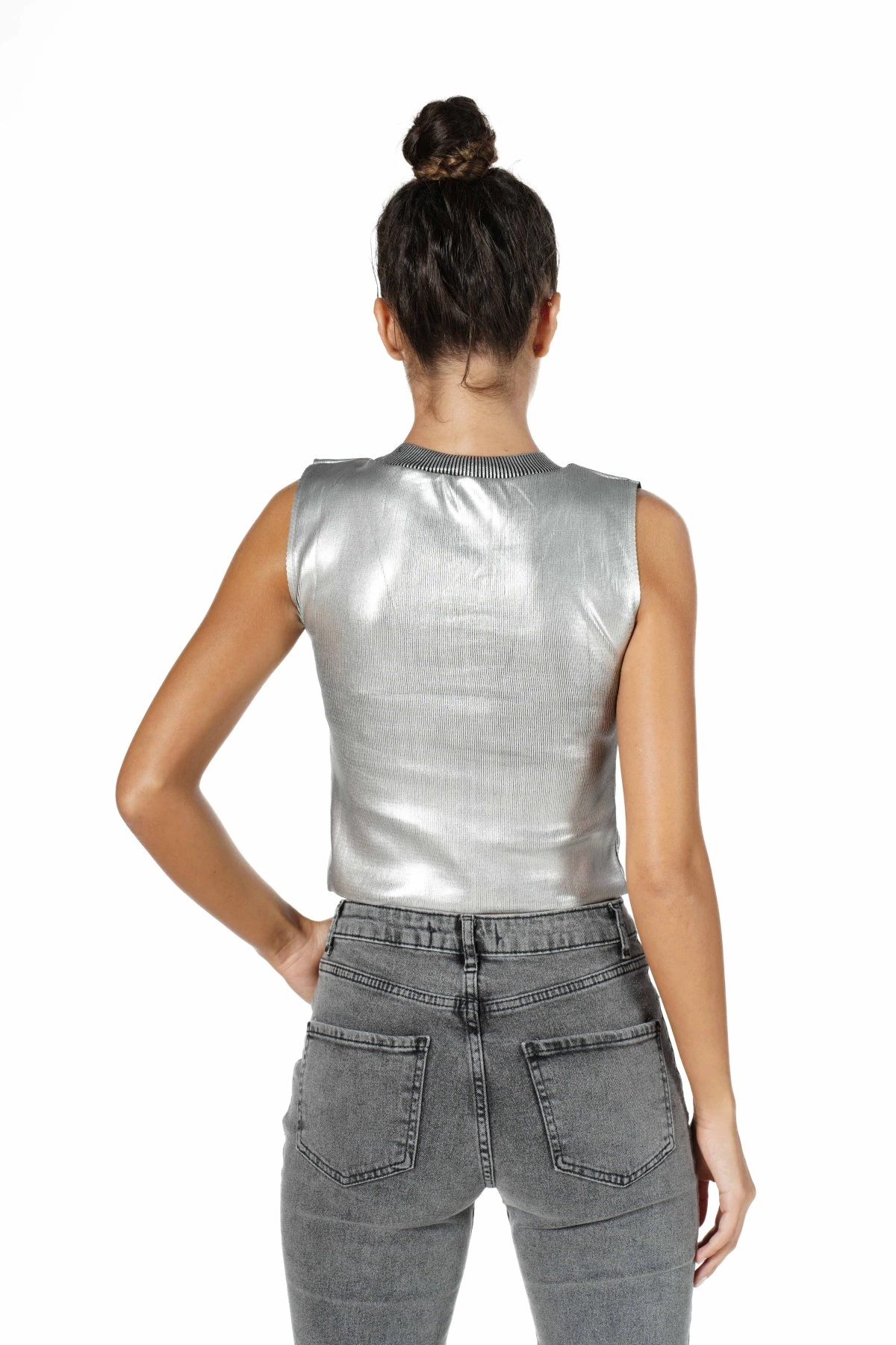 KOLSUZ VARAK BASKI DİK YAKA CROP – GÜMÜŞ