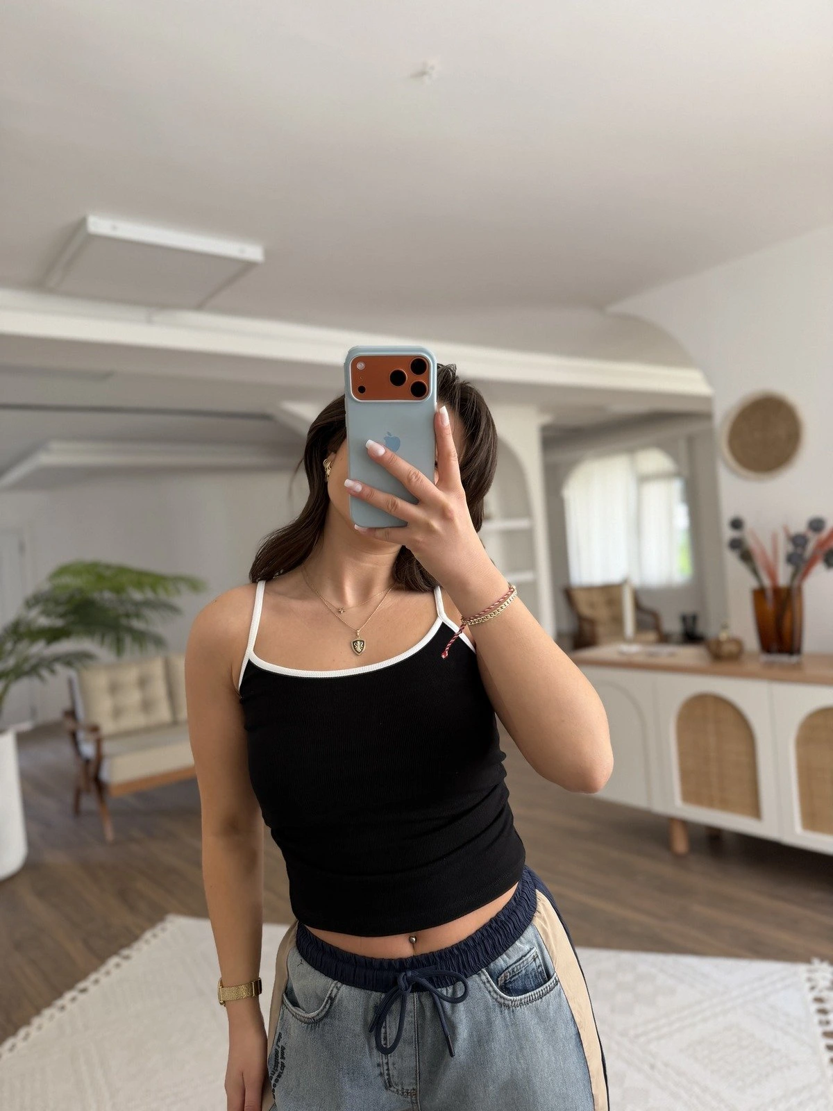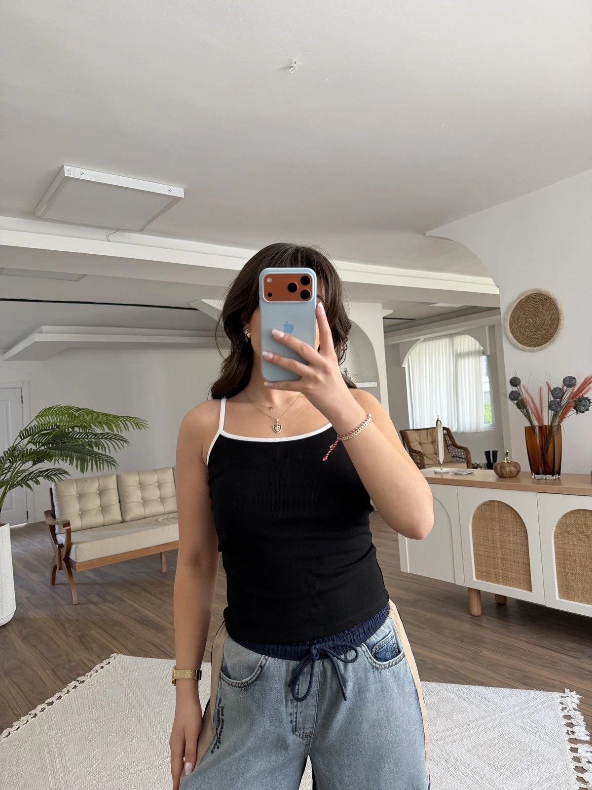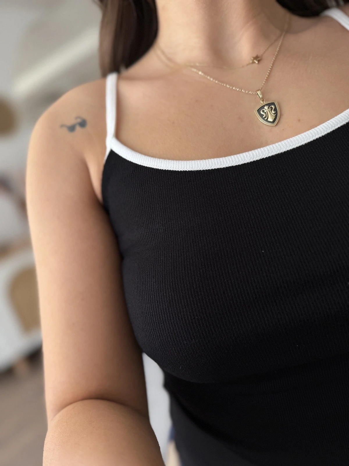 KONTRAST ŞERİTLİ ASKILI VİSKON ATLET – SİYAH