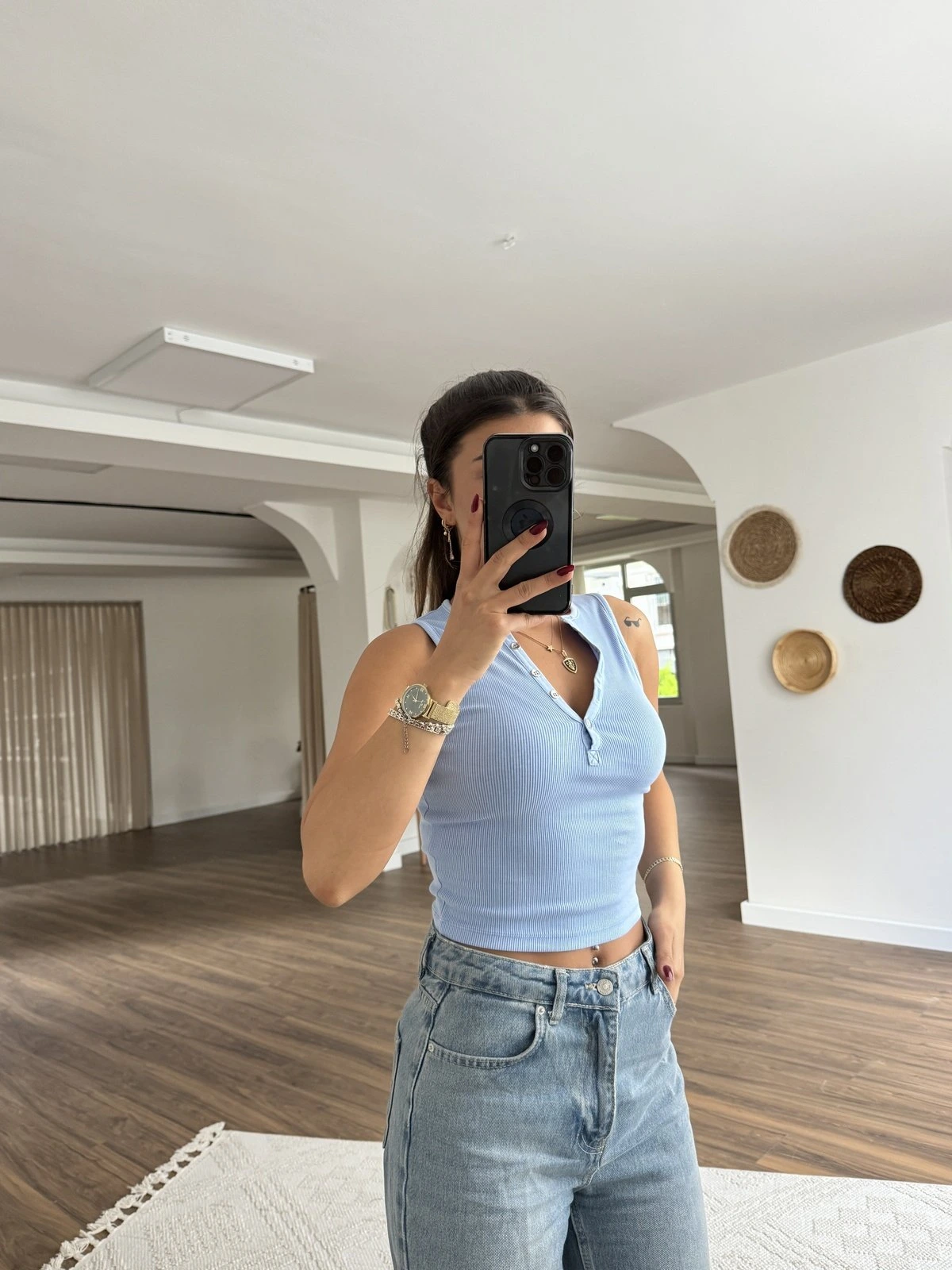 METAL DÜĞME BİSİKLET YAKA PAMUK CROP – MAVİ