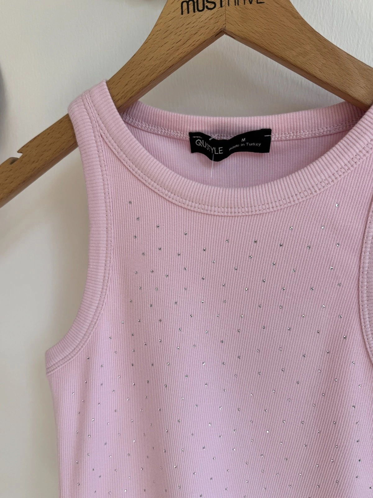 ÖN TAŞ BASKI HALTER YAKA FİTİLLİ PAMUK ATLET – PEMBE