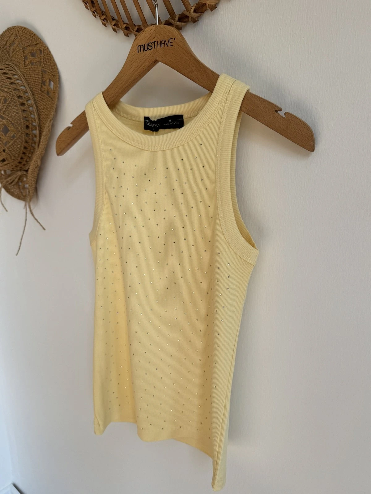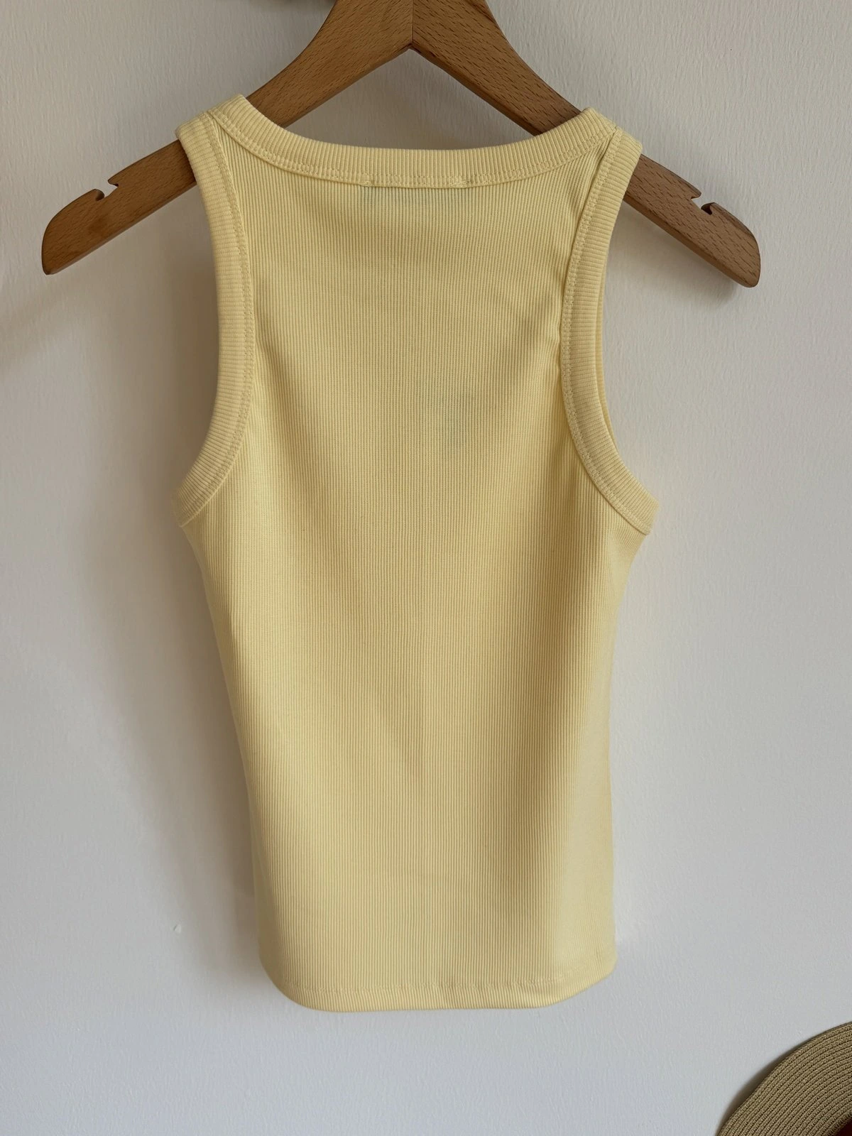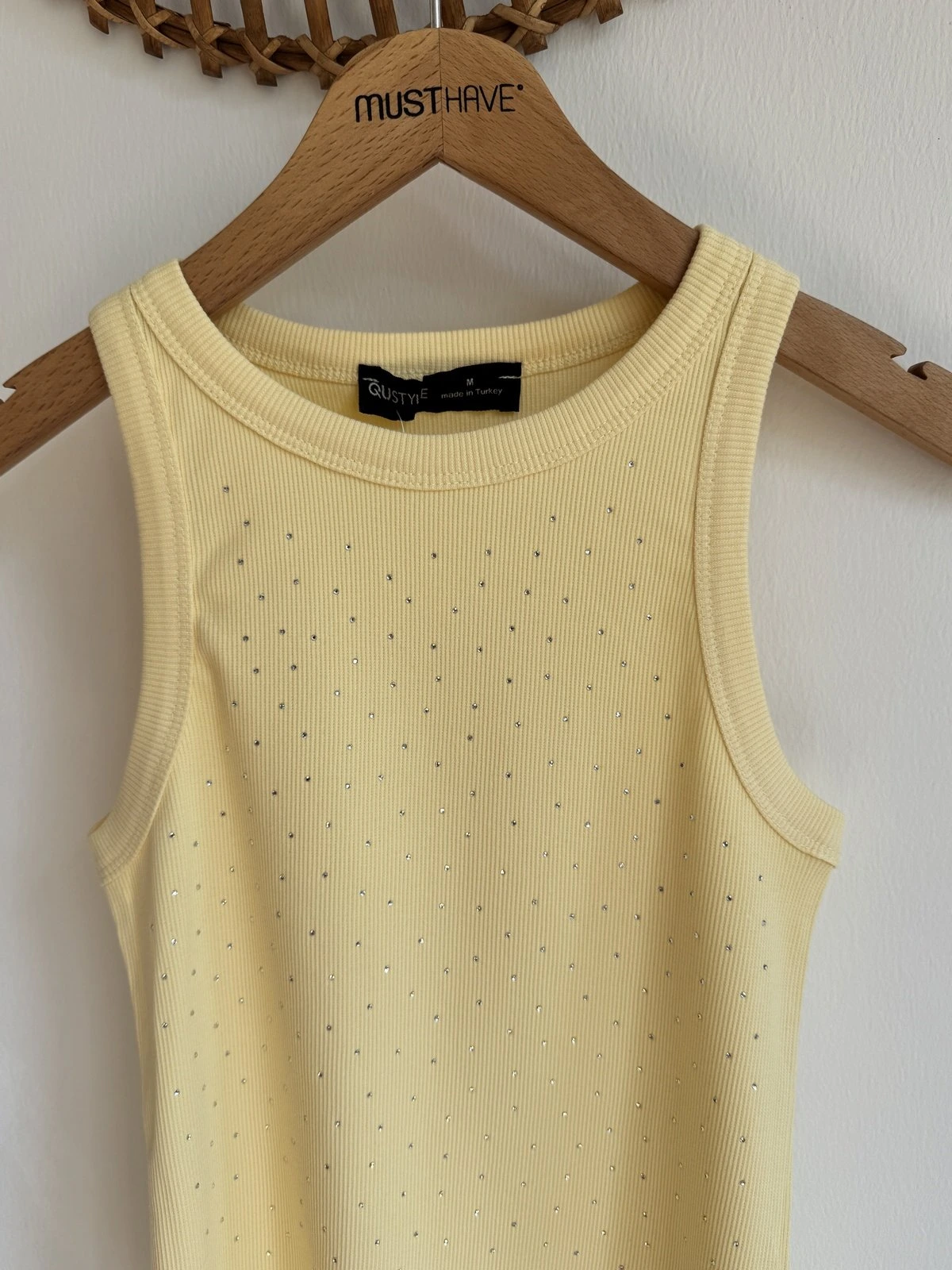 ÖN TAŞ BASKI HALTER YAKA FİTİLLİ PAMUK ATLET – SARI