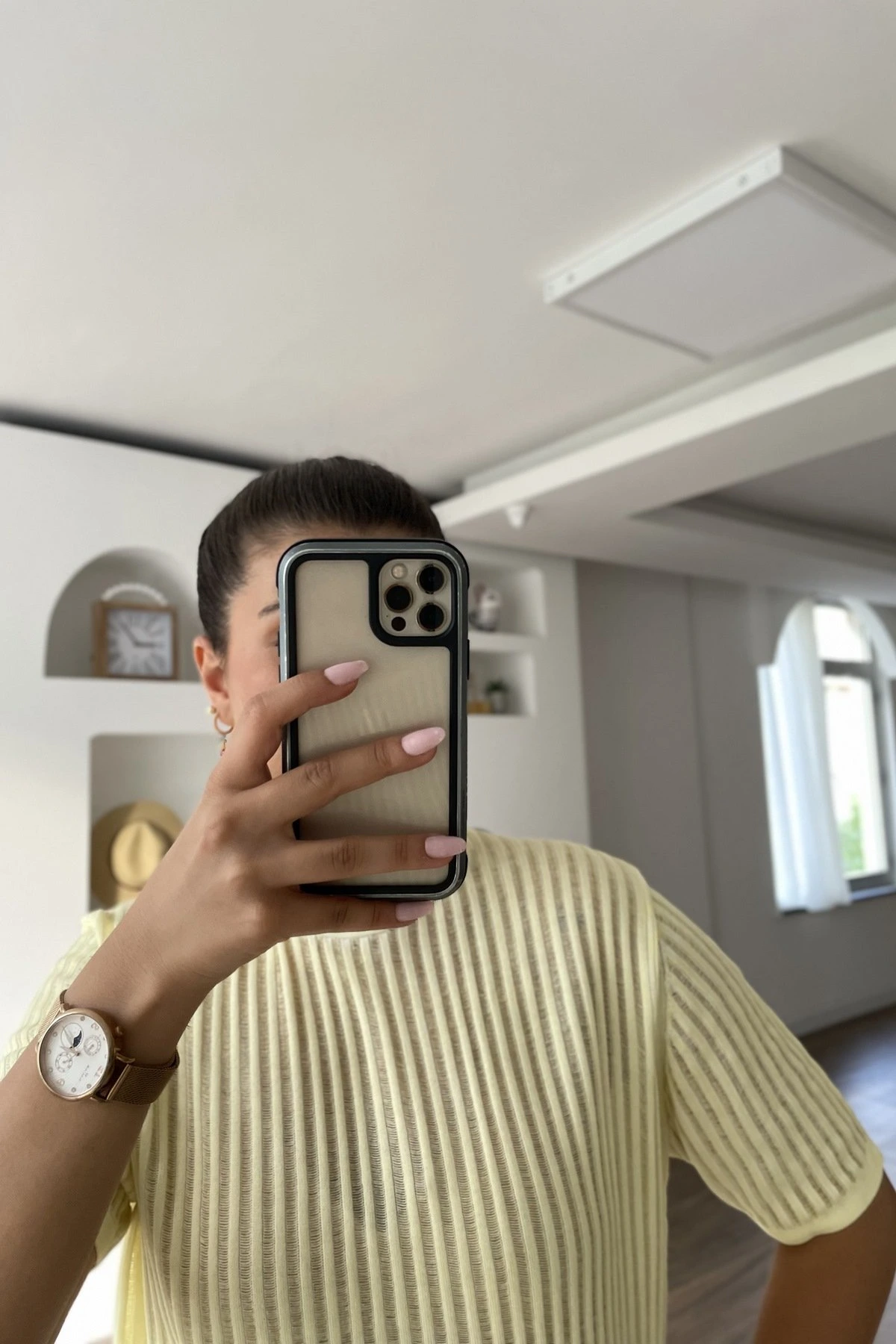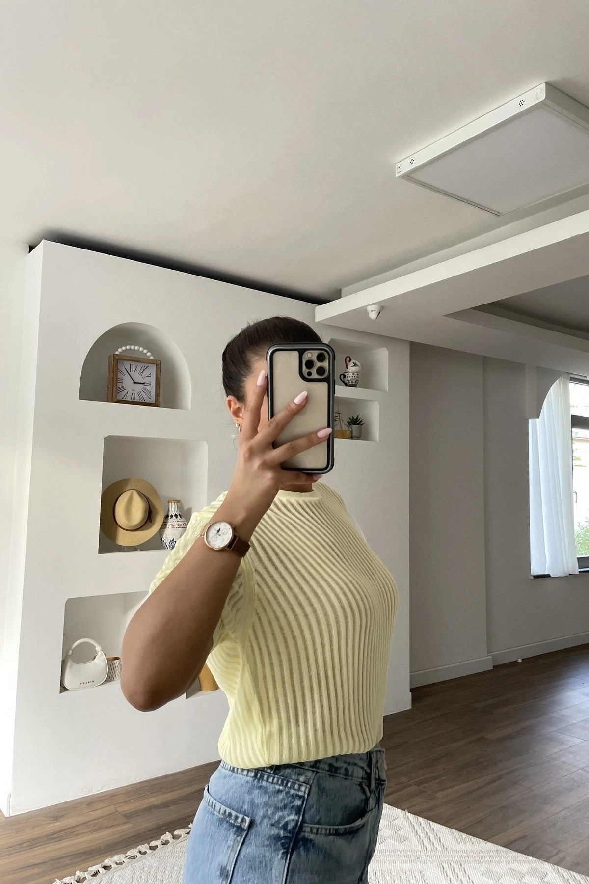 BİSİKLET YAKA AJURLU VİSKON BLUZ – SARI