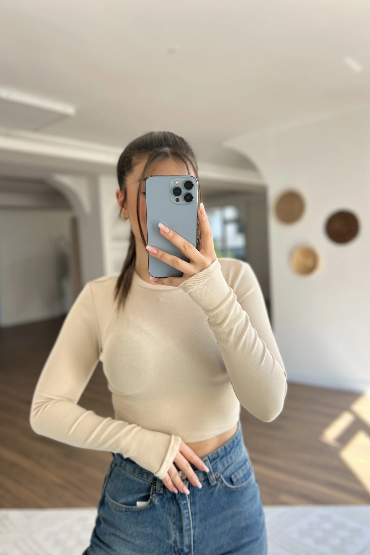 BİSİKLET YAKA PAMUK MODAL KARIŞIM CROP BLUZ – AÇIK BEJ
