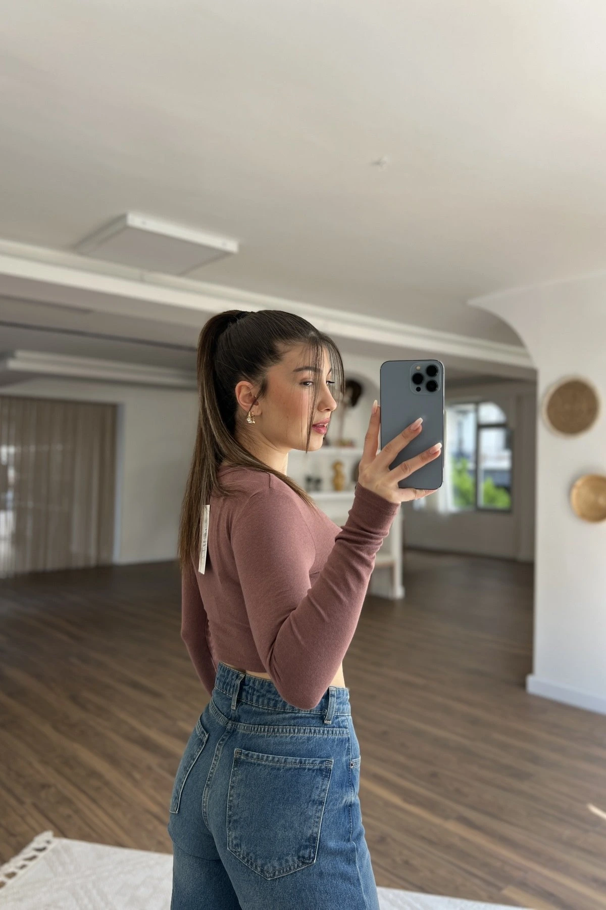 BİSİKLET YAKA PAMUK MODAL KARIŞIM CROP BLUZ – KAHVE