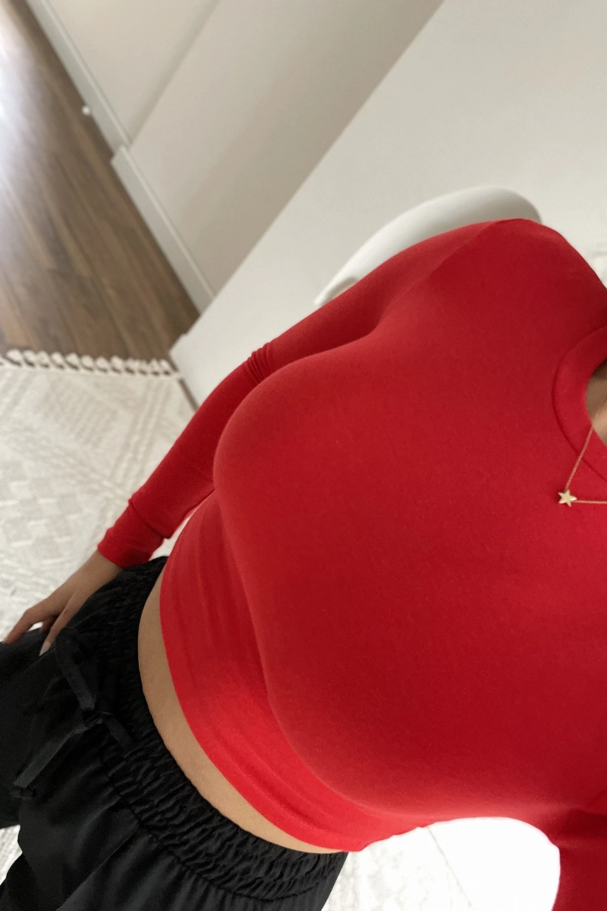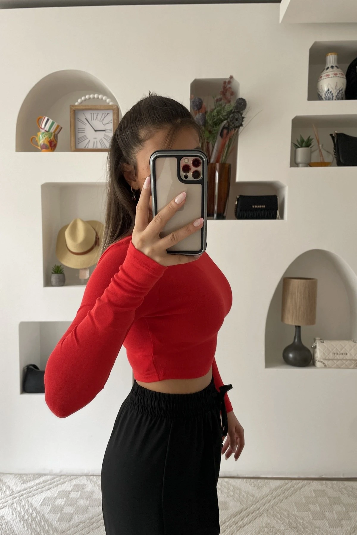 BİSİKLET YAKA PAMUK MODAL KARIŞIM CROP BLUZ – KIRMIZI