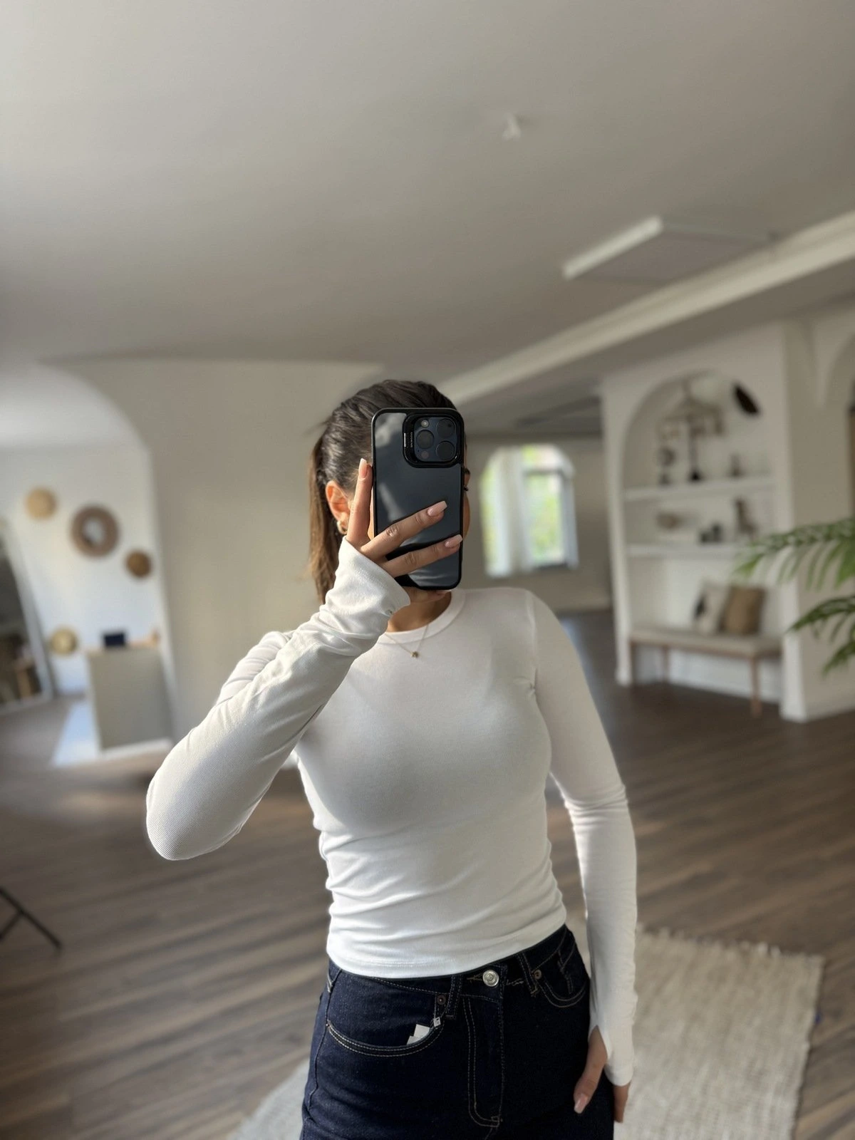 BİSİKLET YAKA PARMAK GEÇMELİ MODAL PAMUK BLUZ – BEYAZ