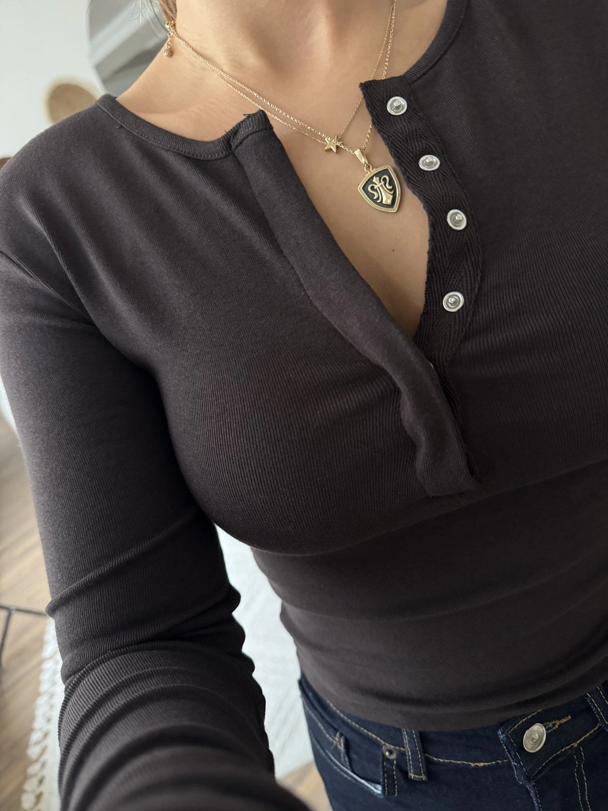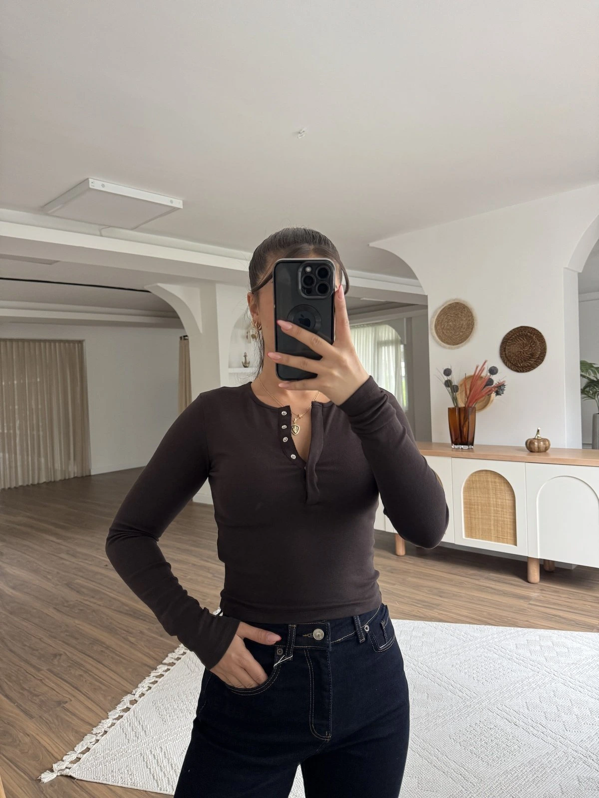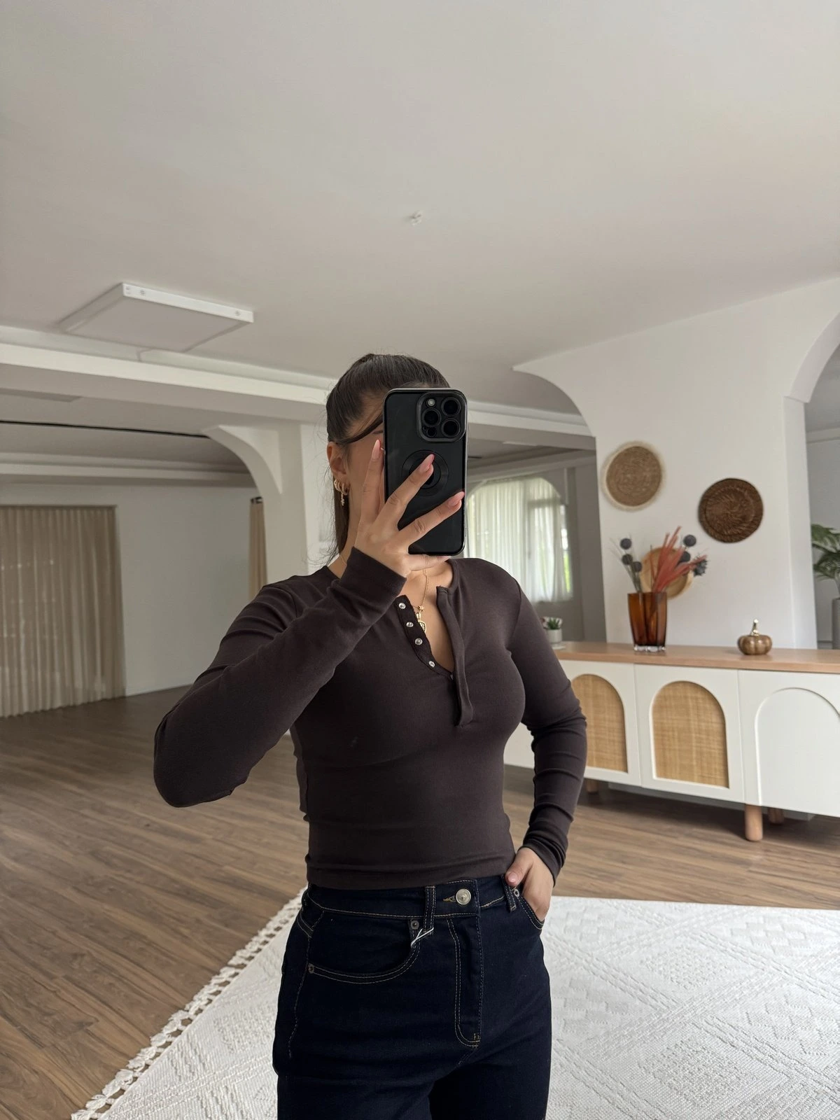 ÇITÇIT DÜĞMELİ UZUN KOL PAMUK MODAL BLUZ – KOYU KAHVE
