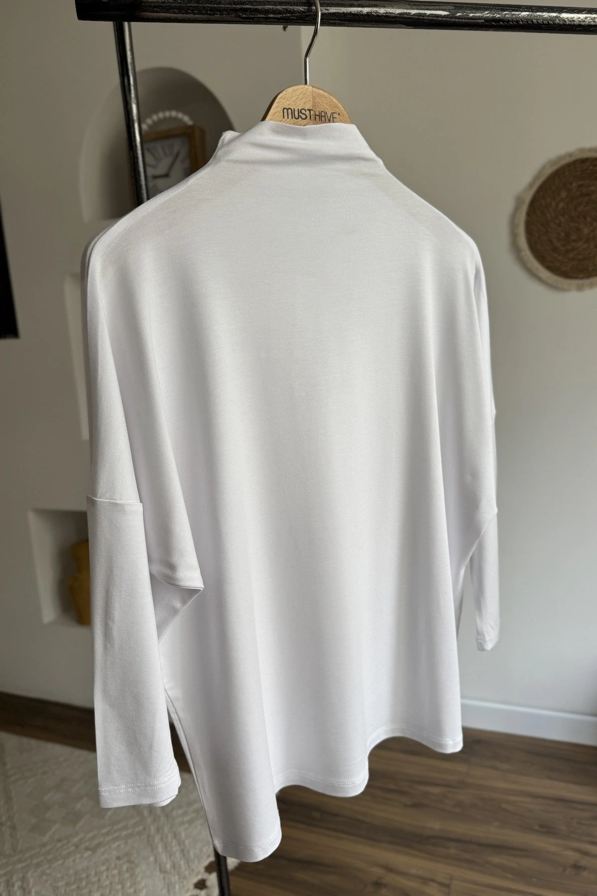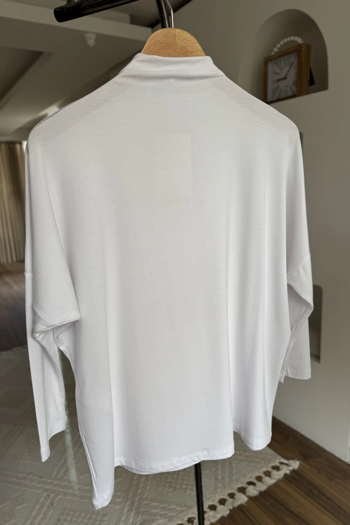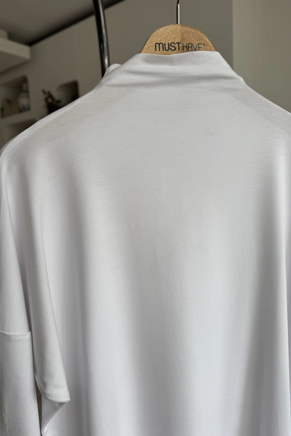 DİK YAKA DÜŞÜK OMUZ VİSKON LİKRA SALAŞ BLUZ – BEYAZ