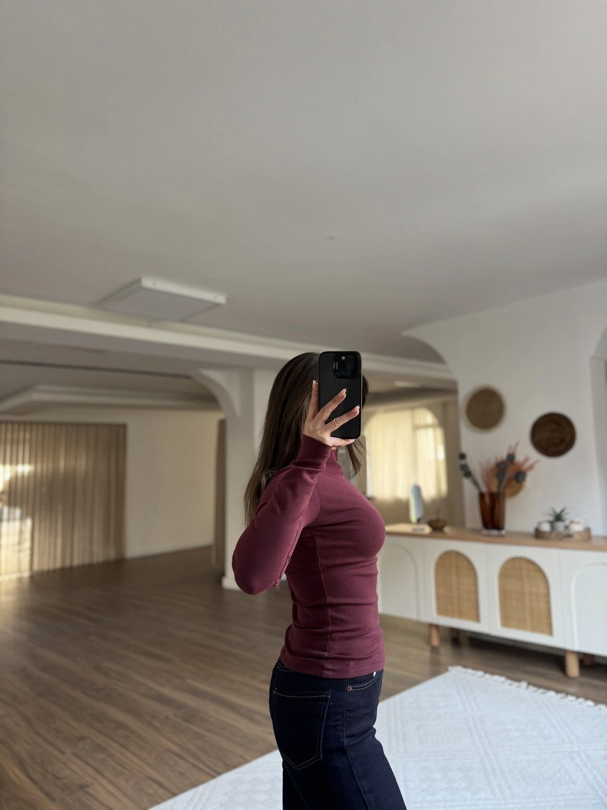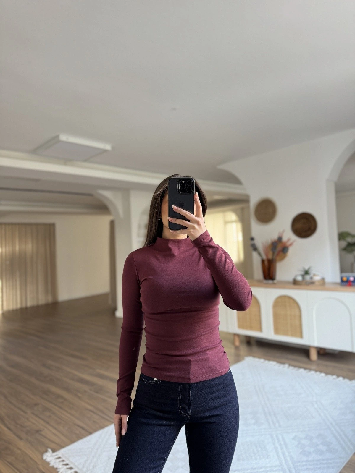 DİK YAKA PAMUK LİKRALI UZUN KOL BLUZ – BORDO