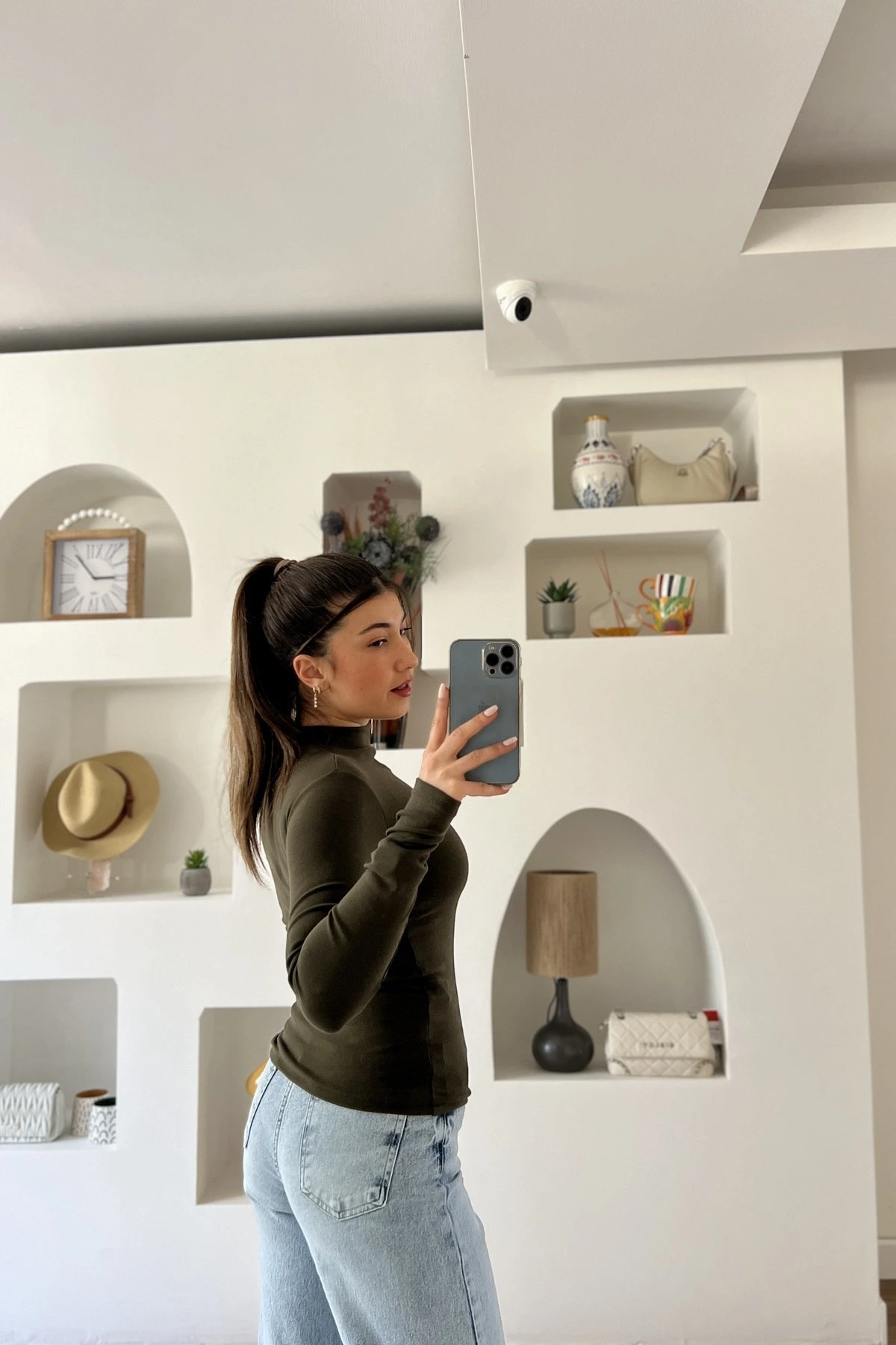 DİK YAKA PAMUK LİKRALI UZUN KOL BLUZ – KOYU HAKİ