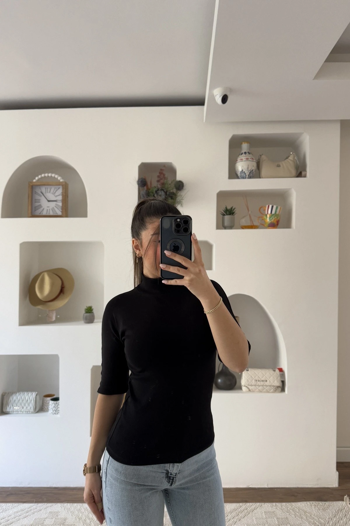 DİK YAKA TRUVAKAR KOL PAMUK BLUZ – SİYAH