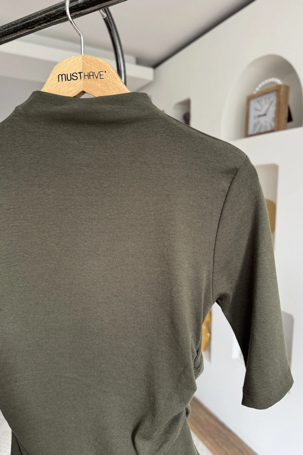 DİK YAKA YAN BÜZGÜ TRUVAKAR KOL PAMUK MODAL BLUZ – KOYU HAKİ