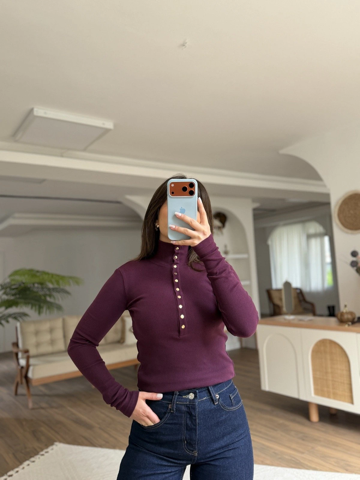 DİK YAKA YARI PATLI GOLD ÇITÇIT PAMUK BLUZ – BORDO