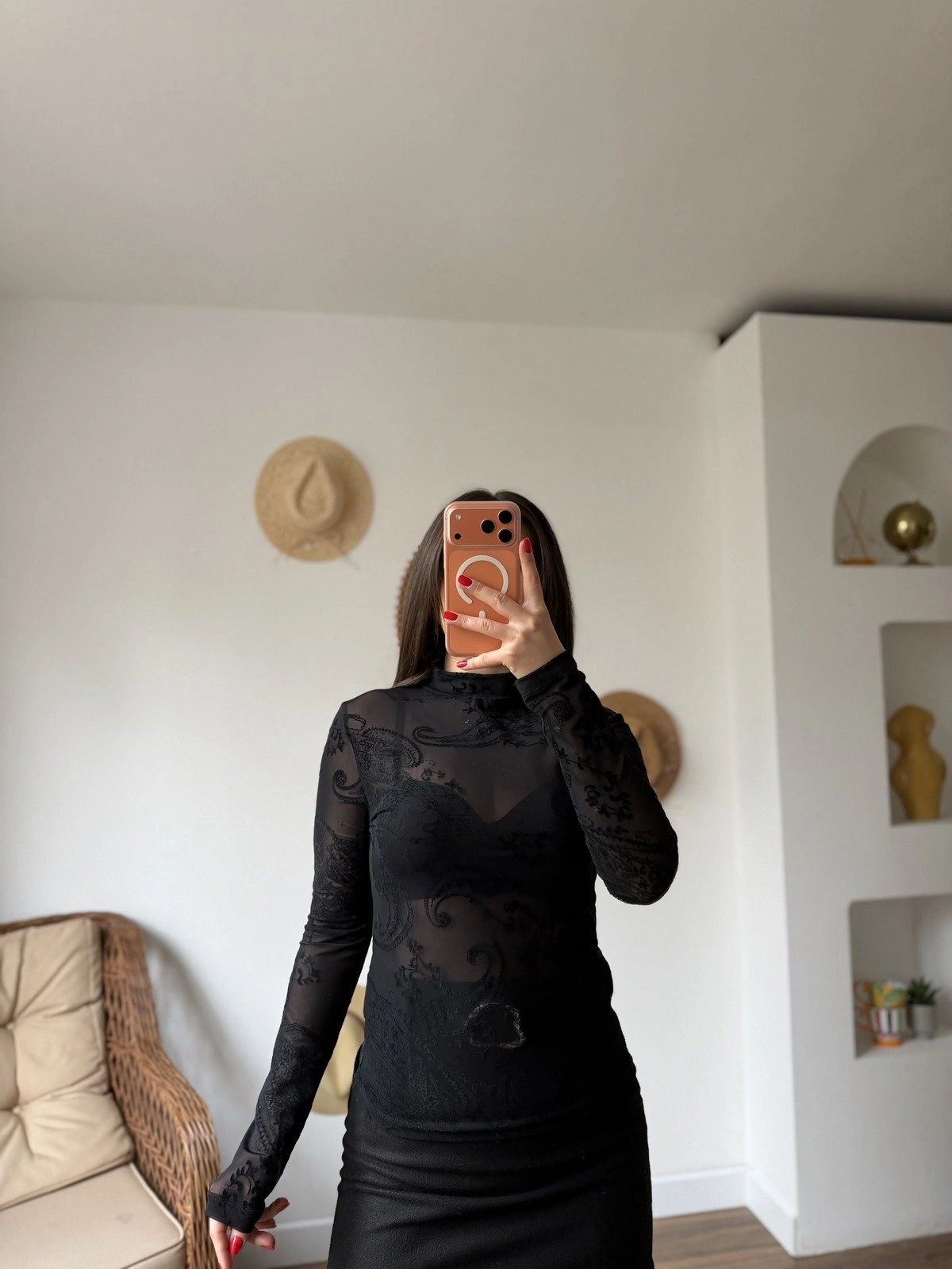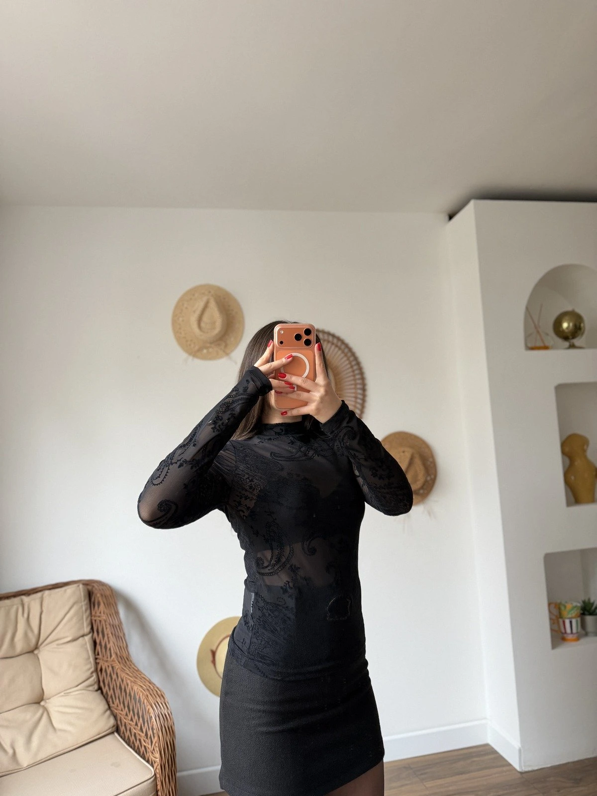 FLOK BASKI DESENLİ TÜL BLUZ – SİYAH