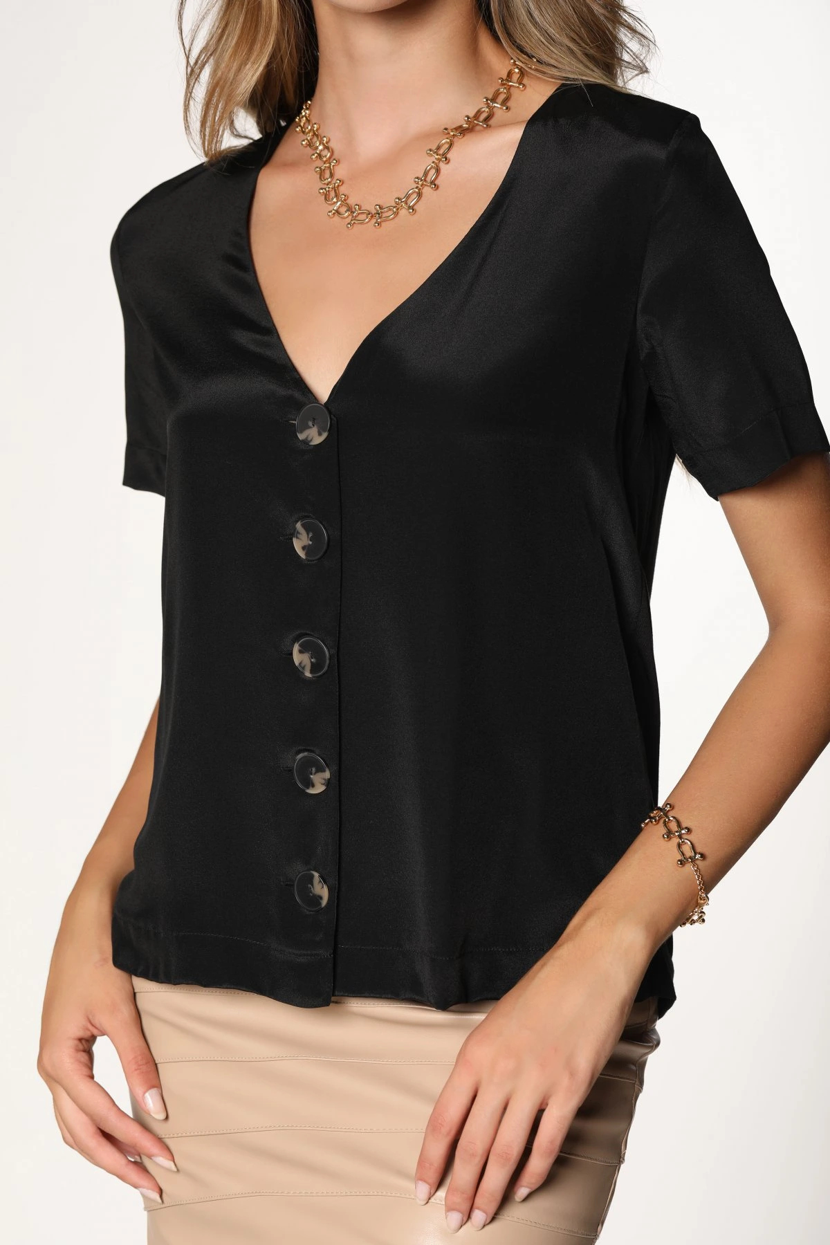 HALLHUBER DÜĞMELİ V YAKA İPEK BLUZ – SİYAH