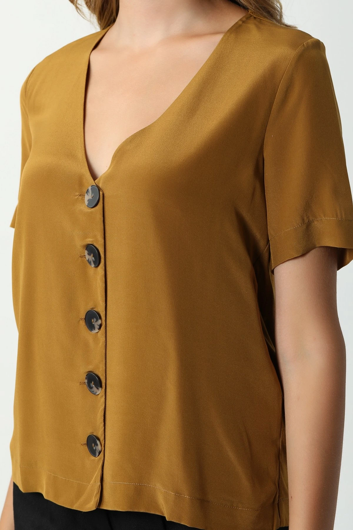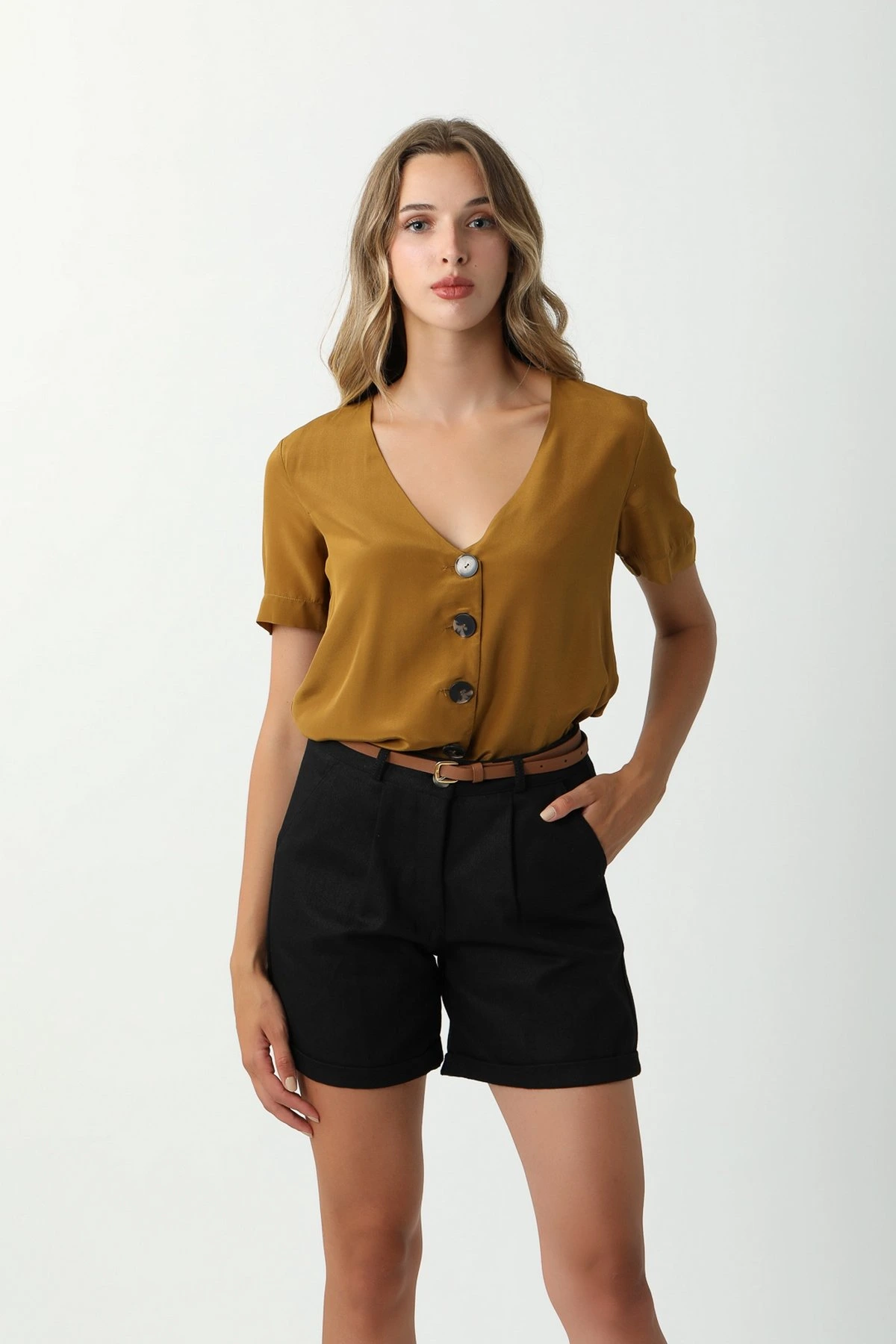 HALLHUBER DÜĞMELİ V YAKA İPEK BLUZ – YAĞ YEŞİL