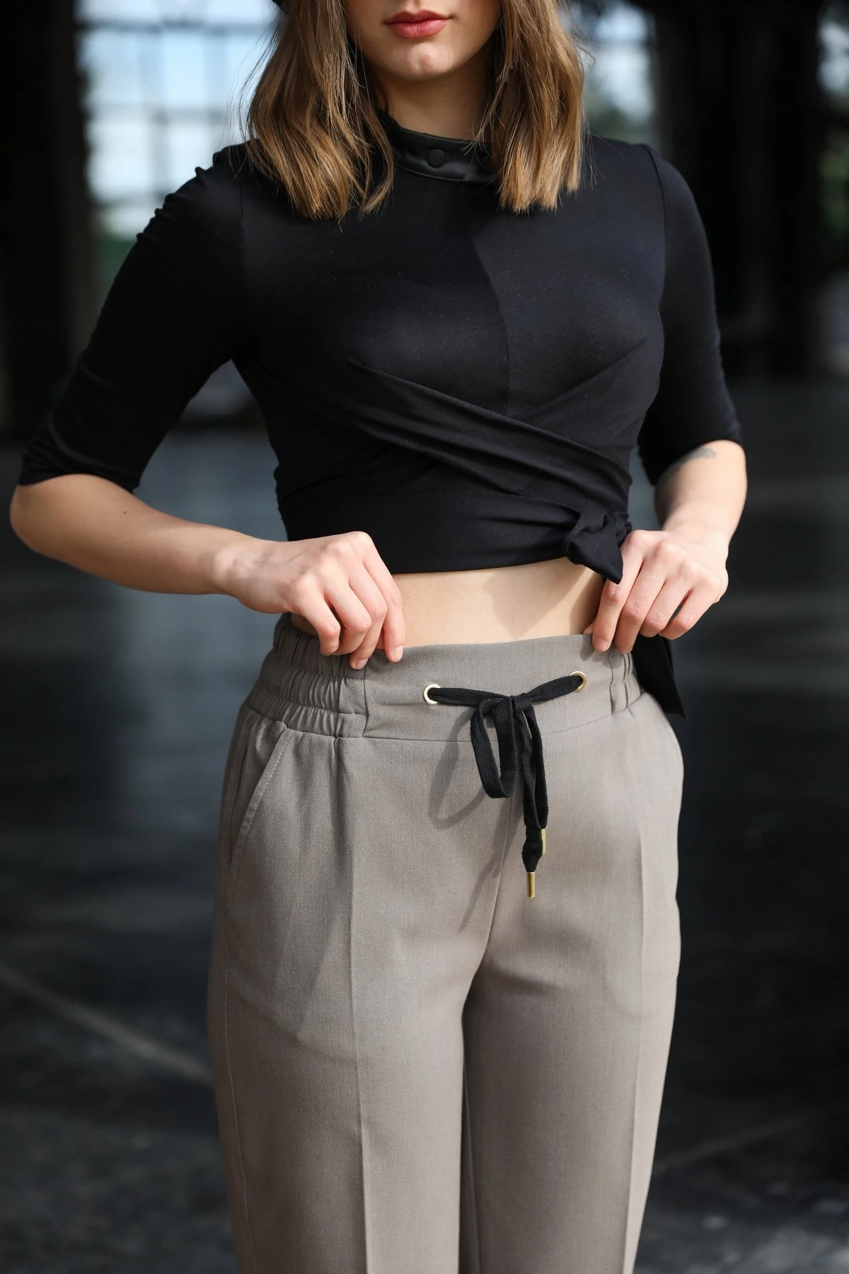 İTHAL BEL KUŞAK DETAY DİK YAKA CROP – SİYAH