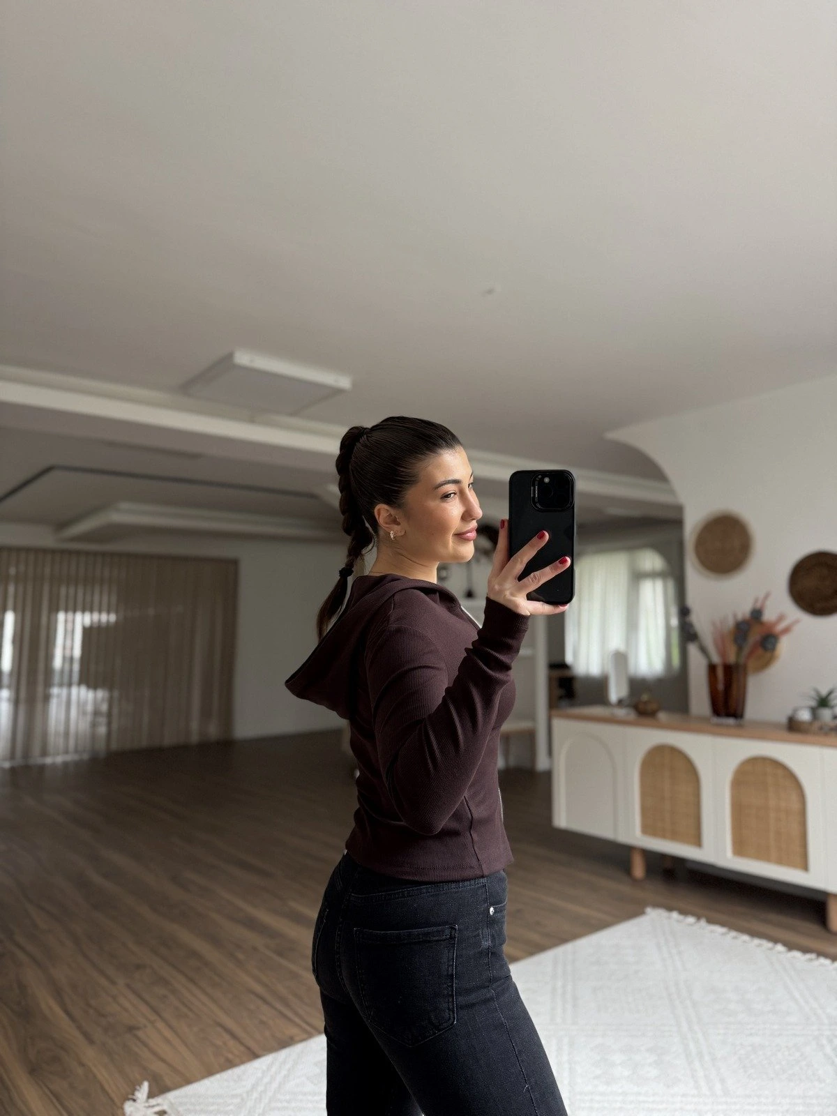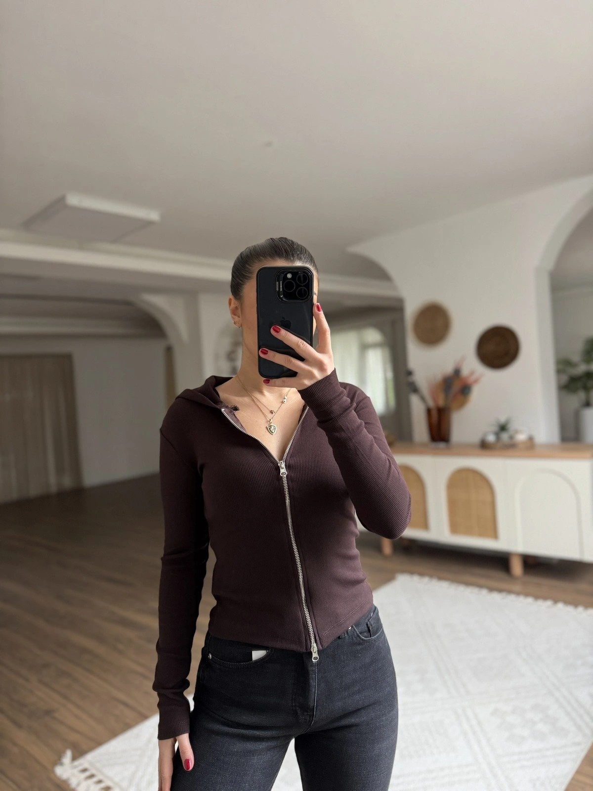 KAPÜŞONLU FERMUARLI PAMUK BLUZ – KAHVE