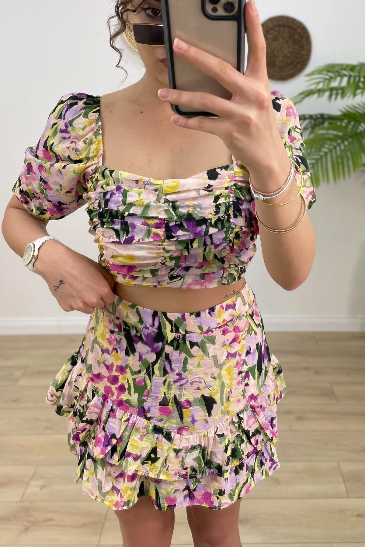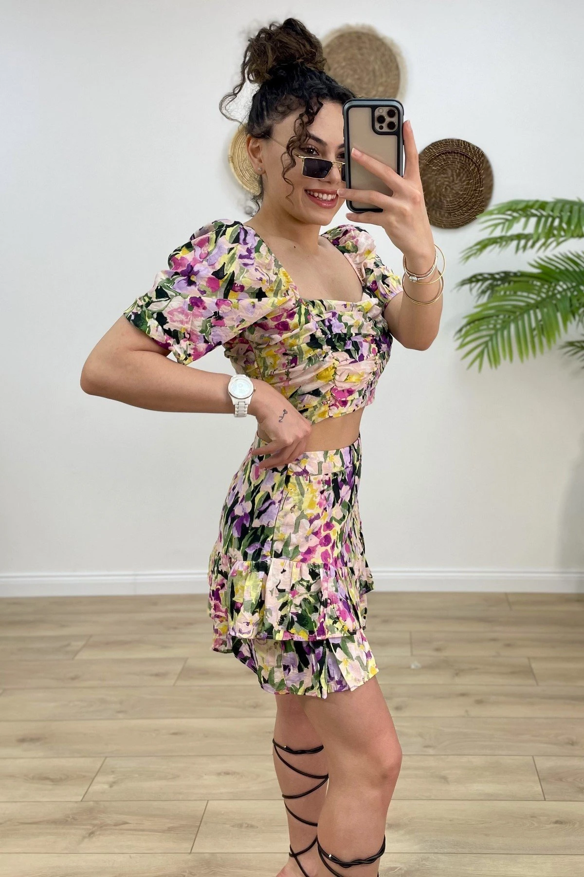 KARPUZ KOL DRAPELİ RENKLİ CROP BLUZ – LİLA