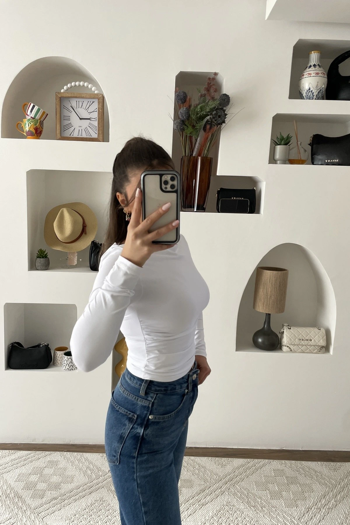KAYIK YAKA ASİMETRİK YAN BÜZGÜ BLUZ – BEYAZ