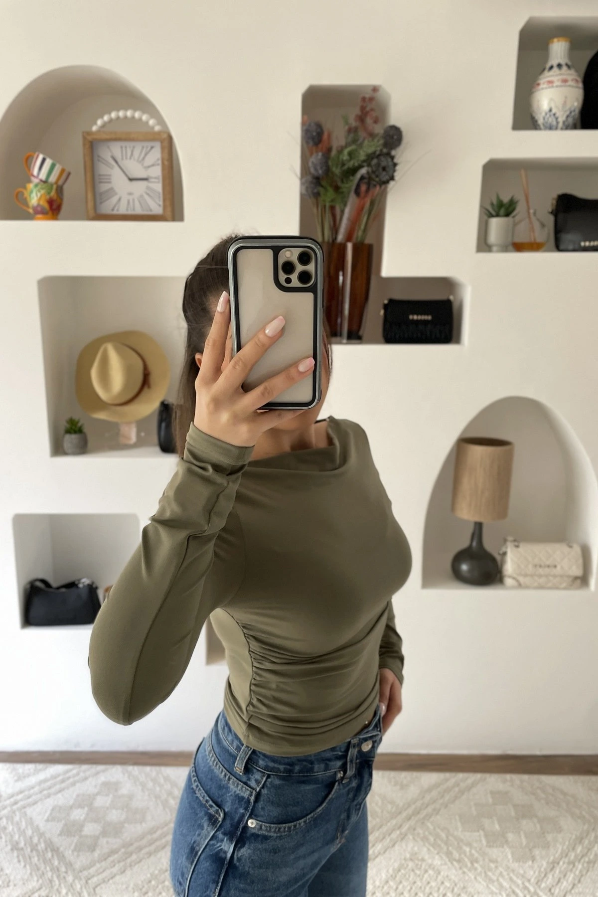 KAYIK YAKA ASİMETRİK YAN BÜZGÜ BLUZ – HAKİ