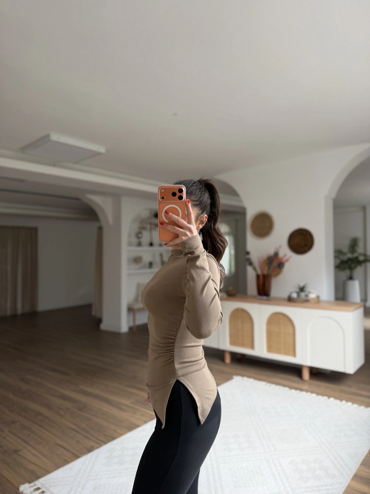 KAYIK YAKA ETEĞİ ASİMETRİK YAN BÜZGÜ PAMUK MODAL BLUZ – VİZON
