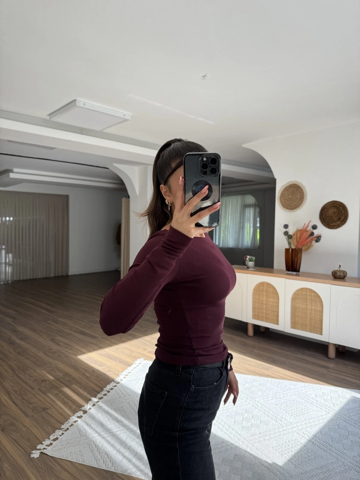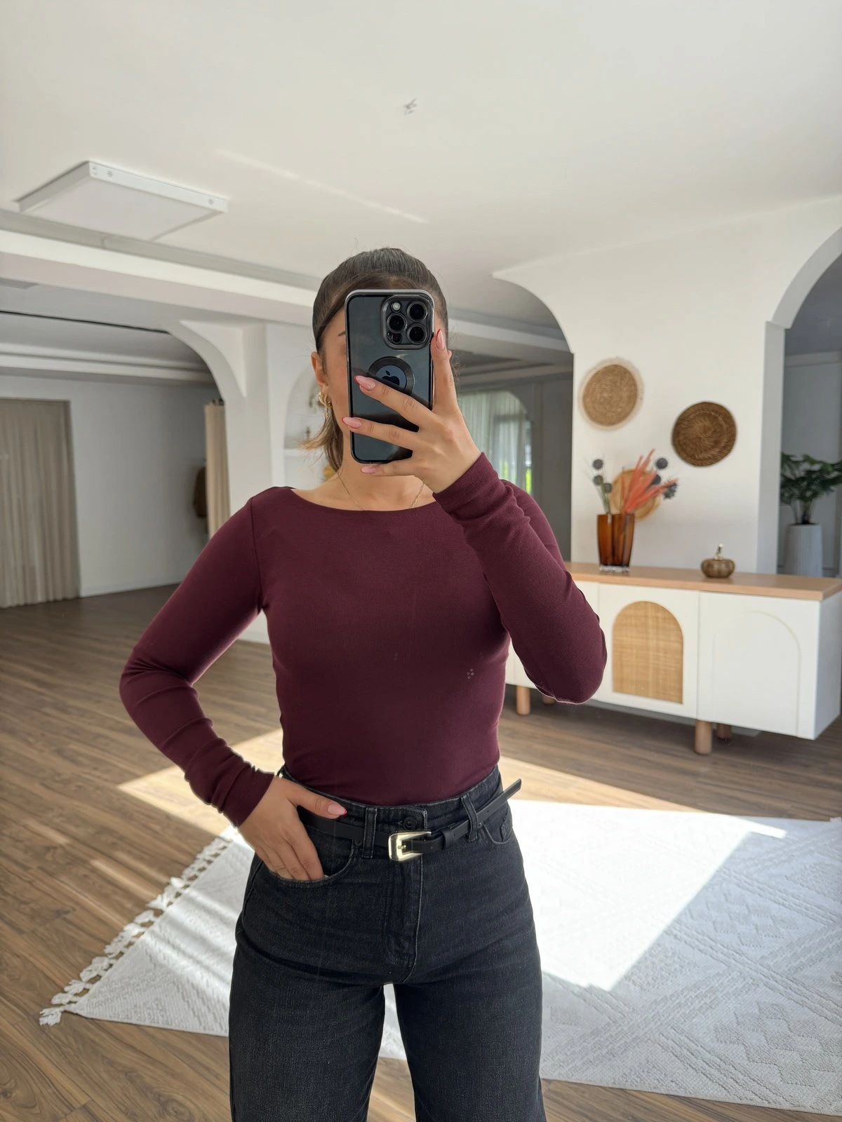 KAYIK YAKA MODAL PAMUK UZUN KOL BLUZ – BORDO