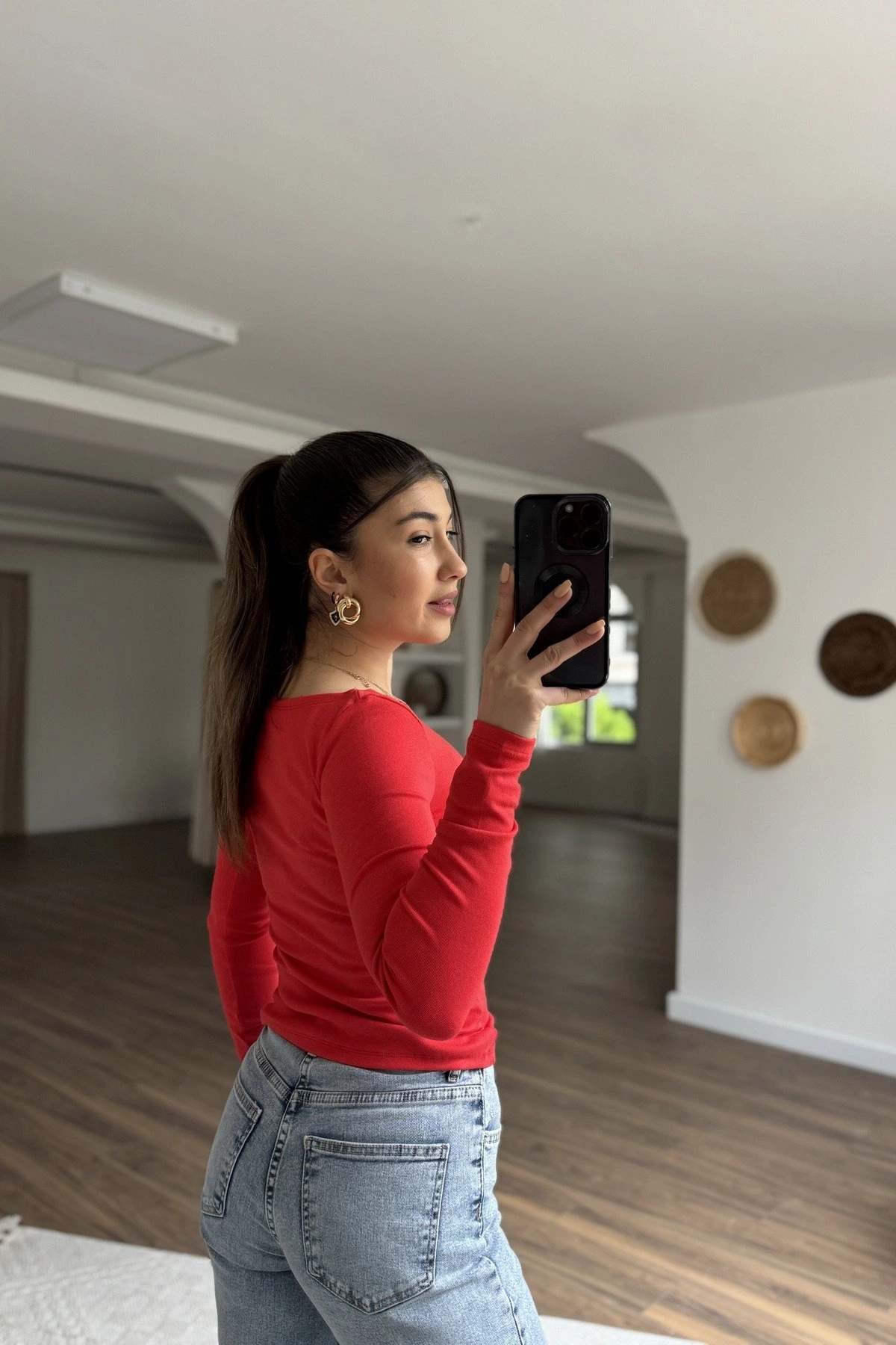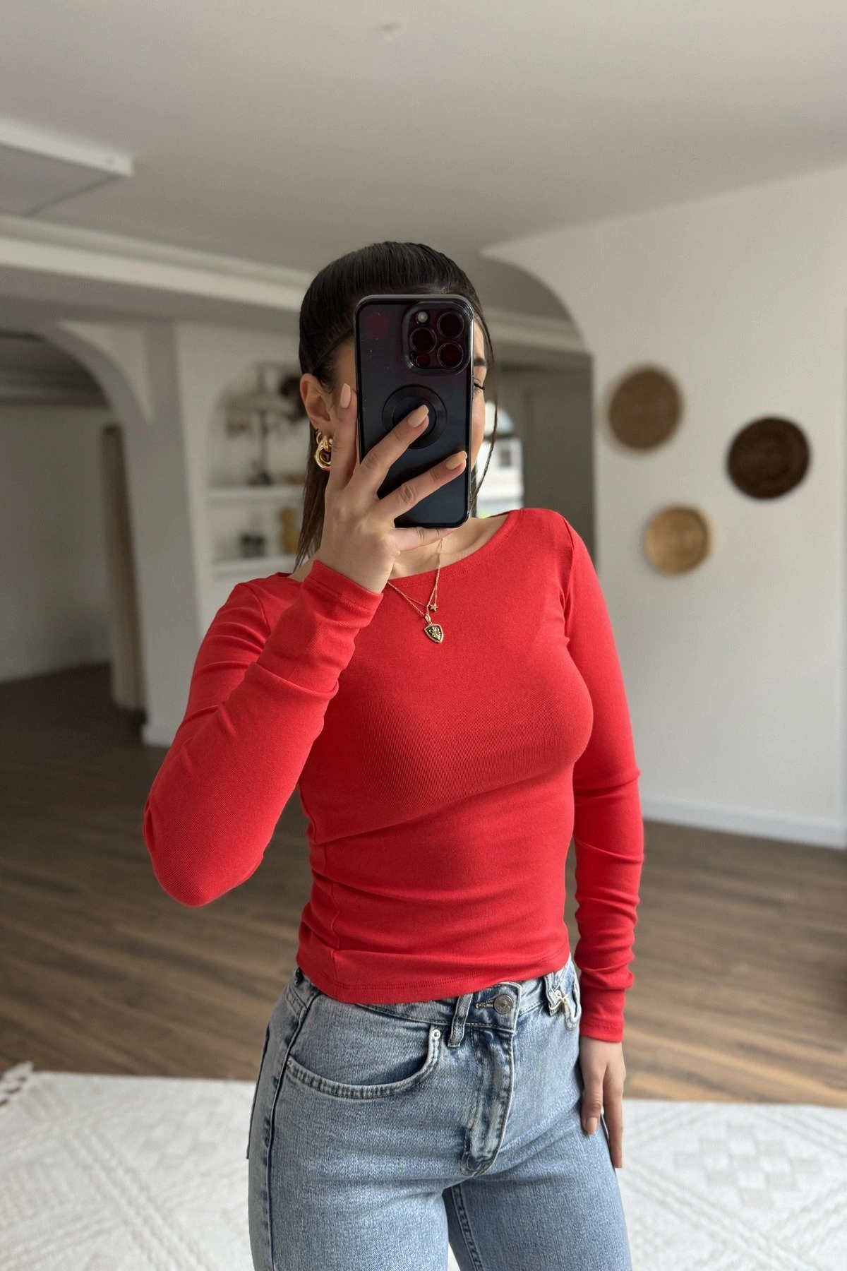KAYIK YAKA MODAL PAMUK UZUN KOL BLUZ – KIRMIZI