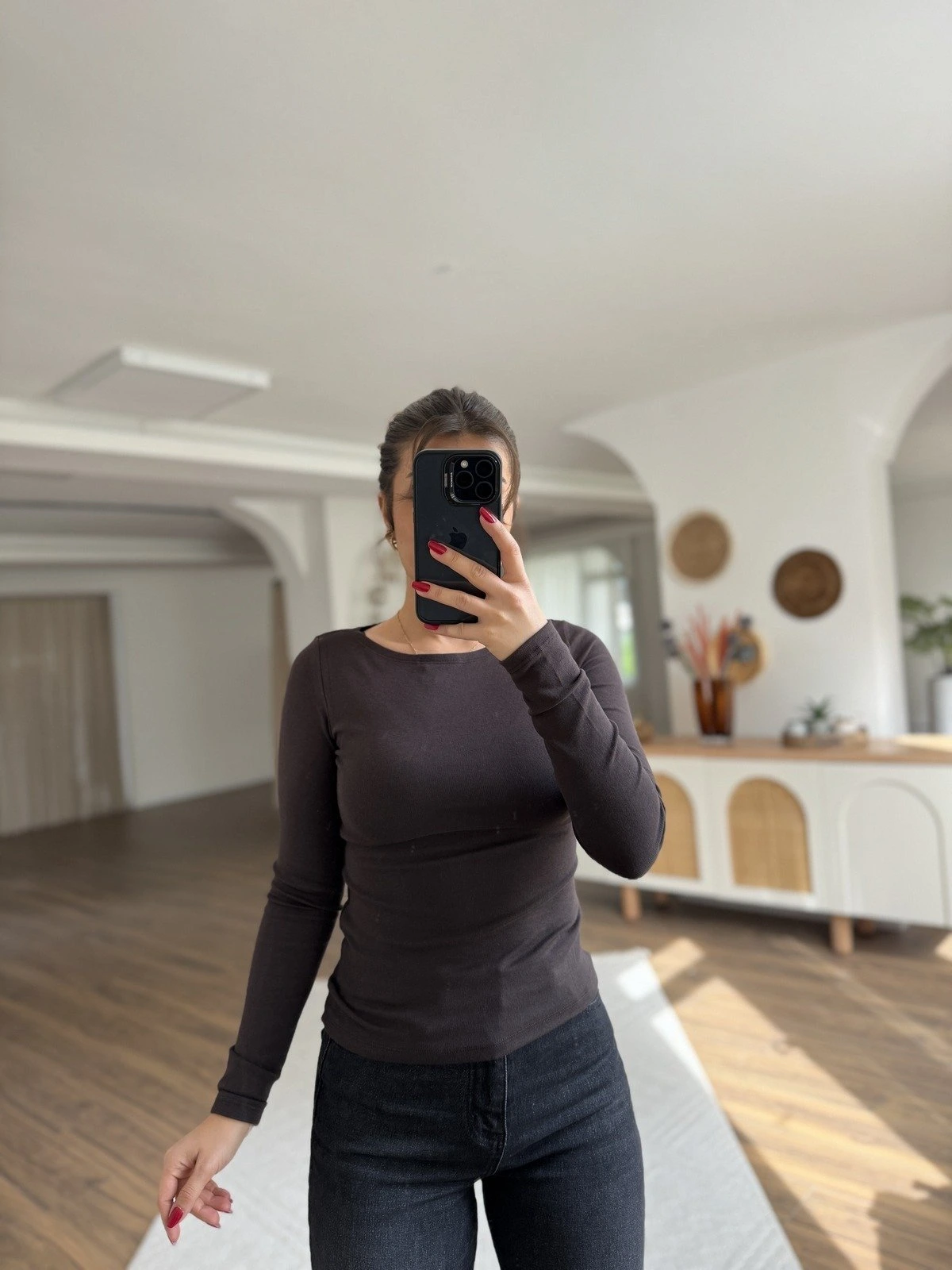 KAYIK YAKA MODAL PAMUK UZUN KOL BLUZ – KOYU KAHVE