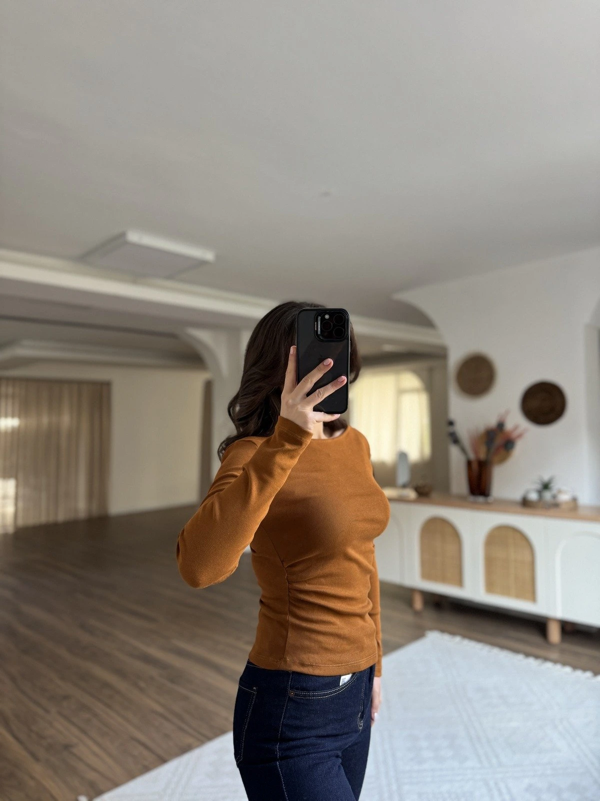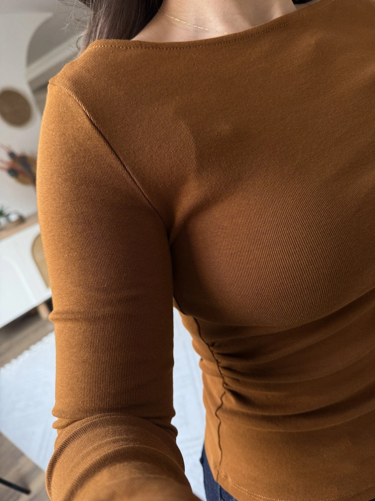 KAYIK YAKA YAN BÜZGÜLÜ UZUN KOL BLUZ – KOYU KİREMİT