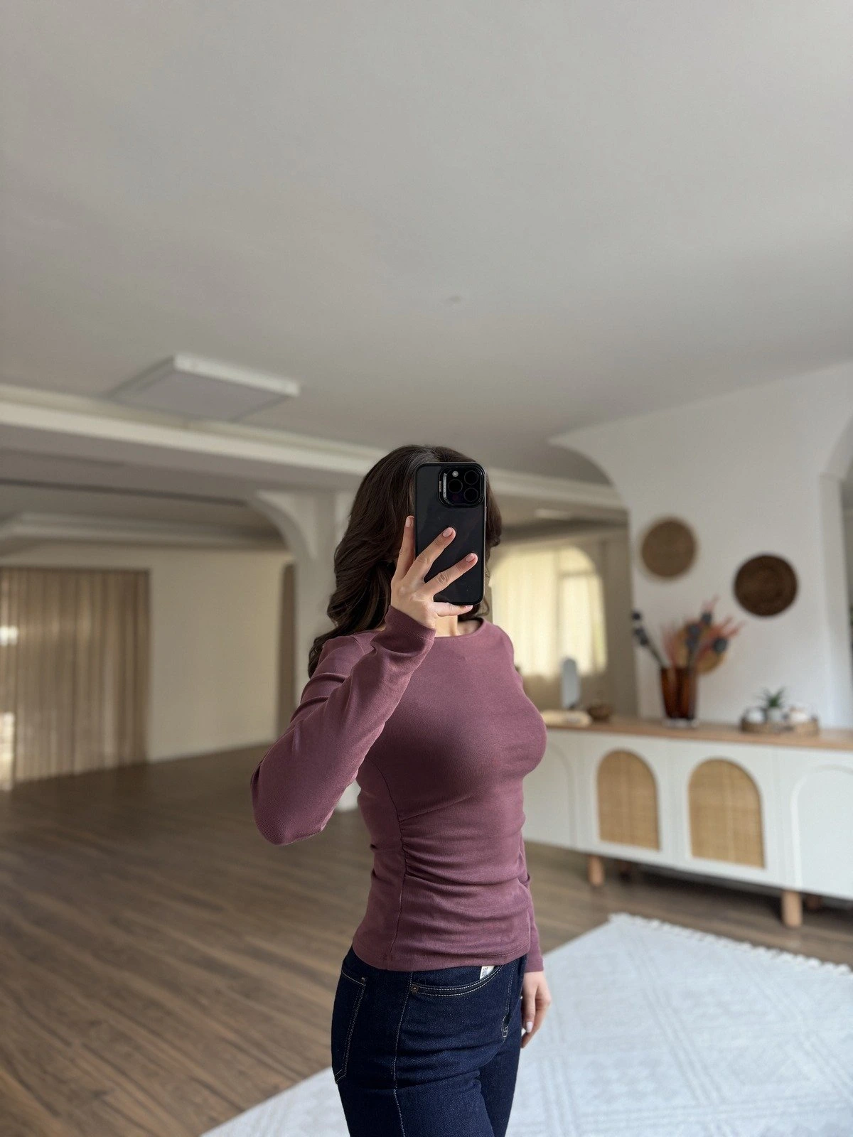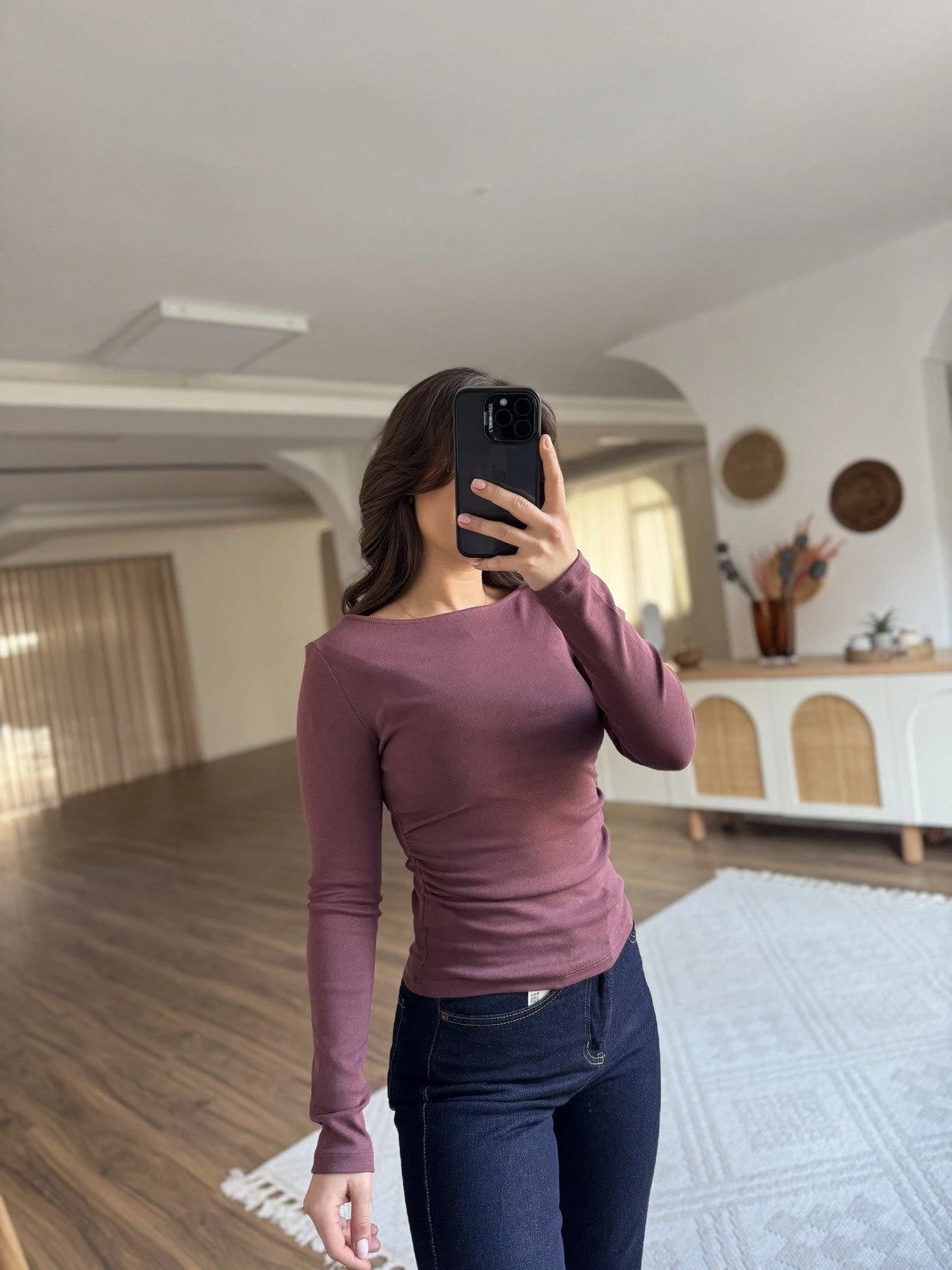 KAYIK YAKA YAN BÜZGÜLÜ UZUN KOL BLUZ – MÜRDÜM