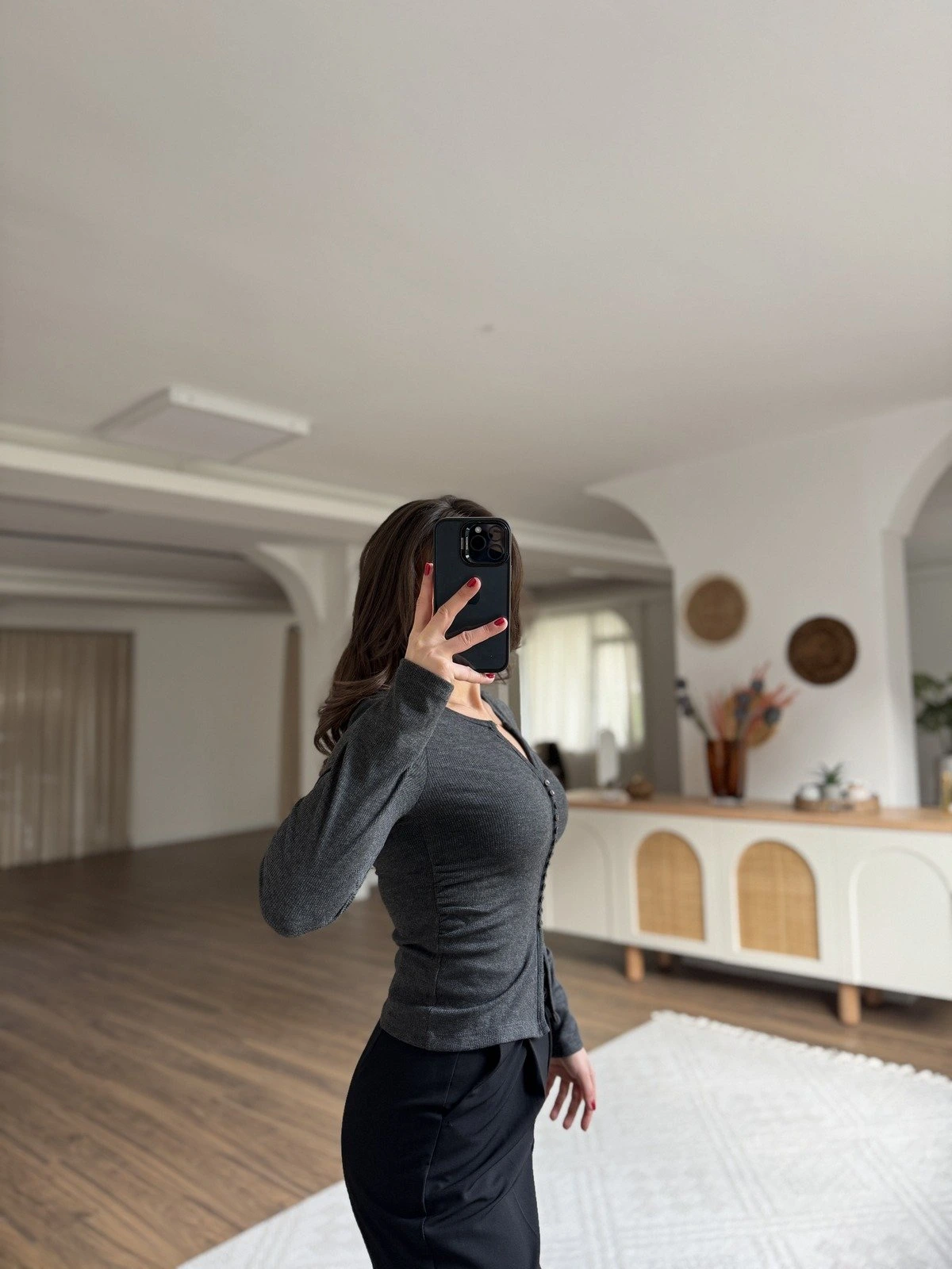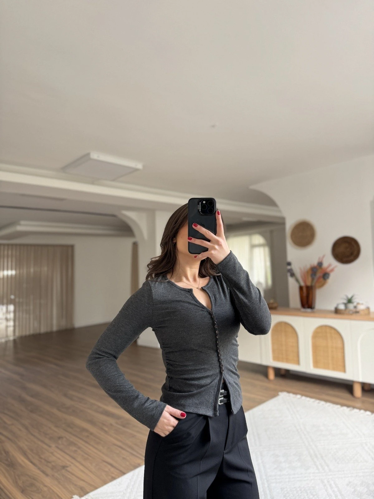 KÜÇÜK SIRA DÜĞME DETAY YAN BÜZGÜ VİSKON BLUZ – ANTRASİT
