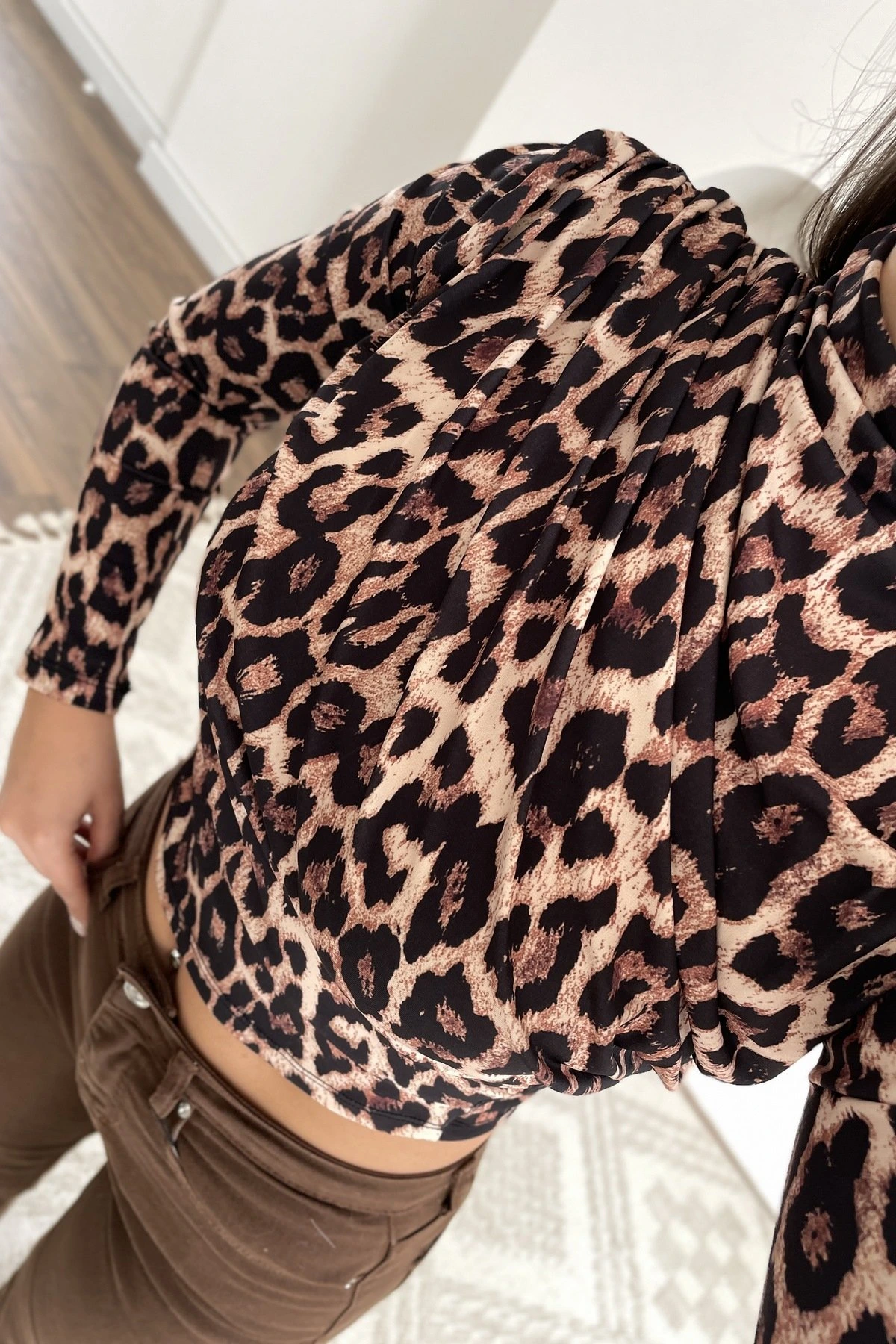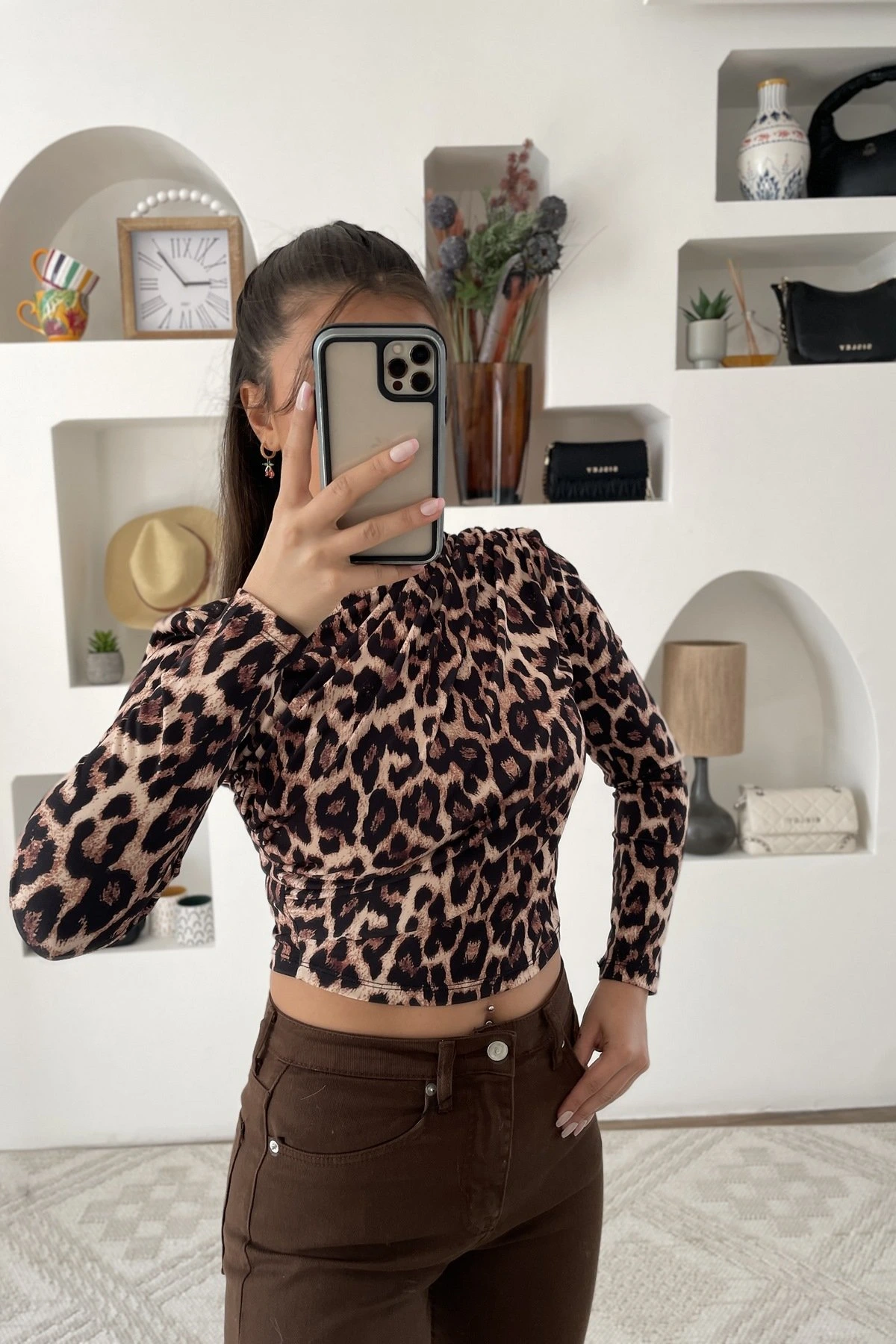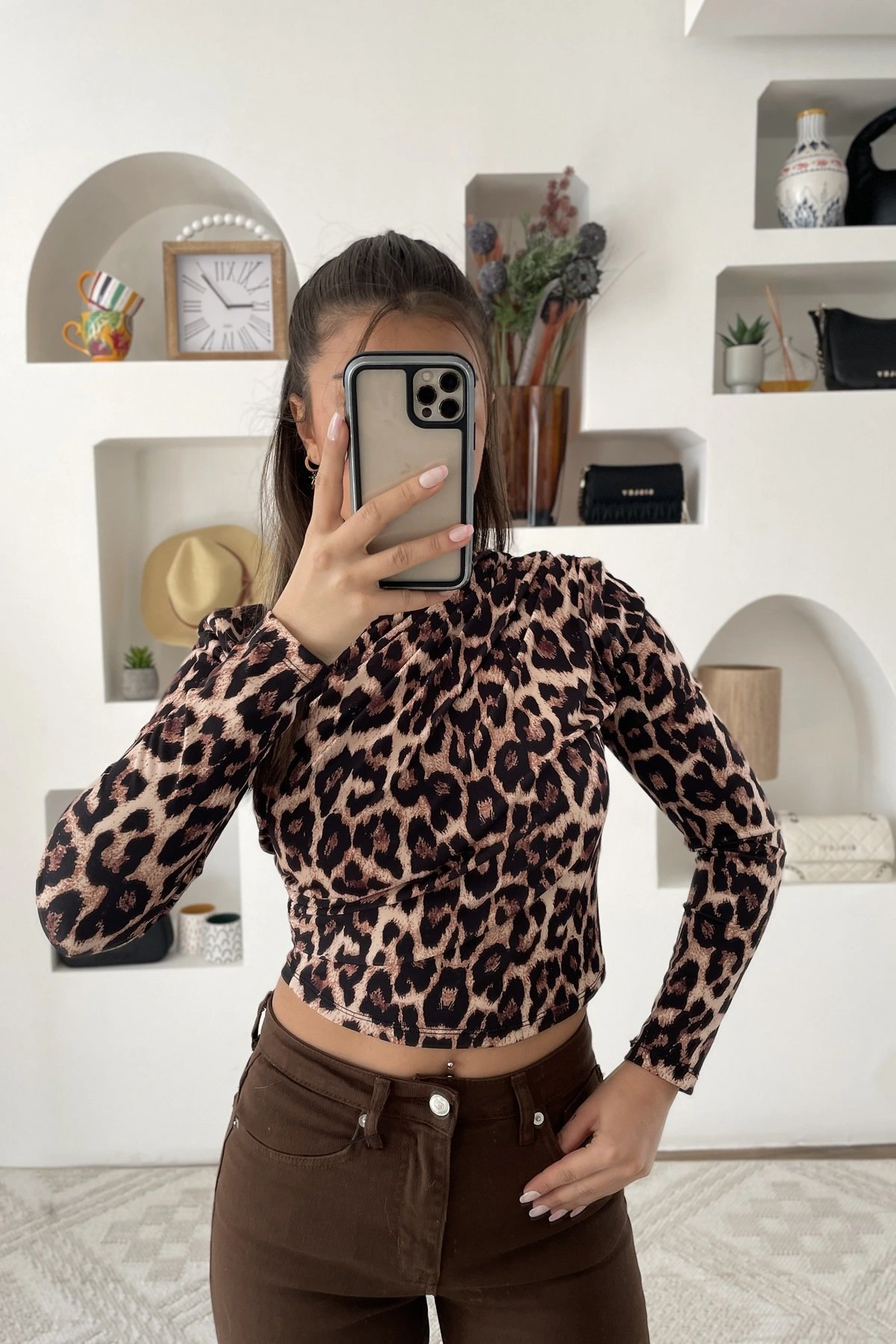 OMUZ YAN BÜZGÜ DİK YAKA LEOPAR CROP PAMUK BLUZ – LEOPAR