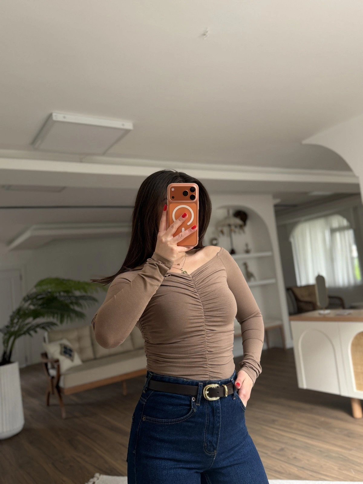 ÖN ARKA BÜZGÜ PARMAK GEÇME OMUZ AÇIK BLUZ – VİZON