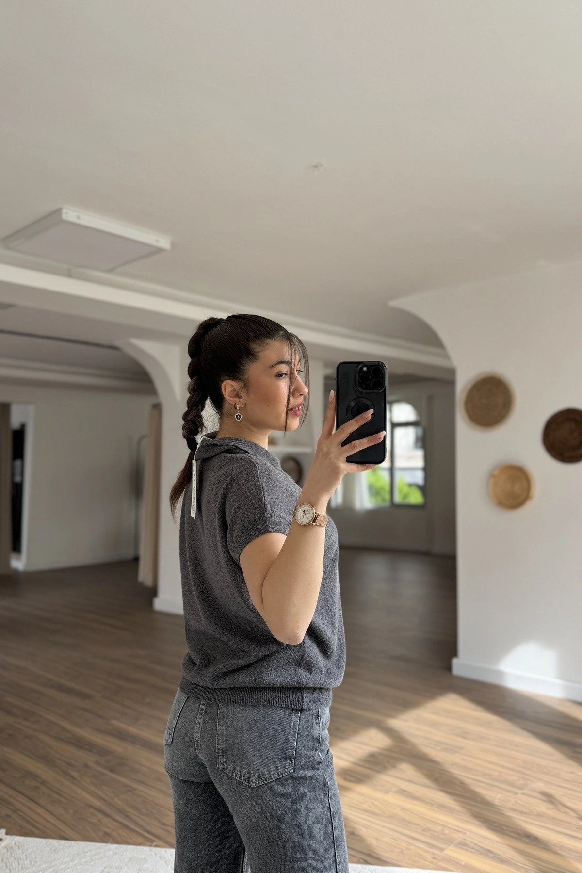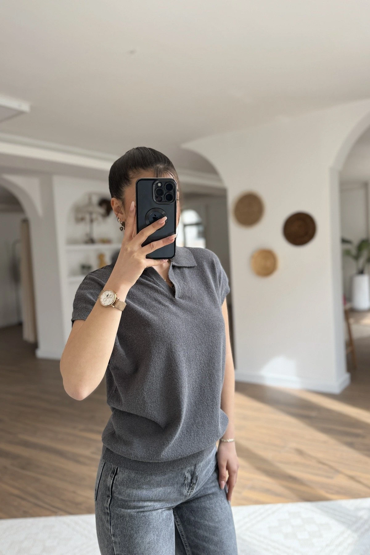 POLO YAKA DÜŞÜK KOL PAMUK İNCE TRİKO BLUZ – FÜME