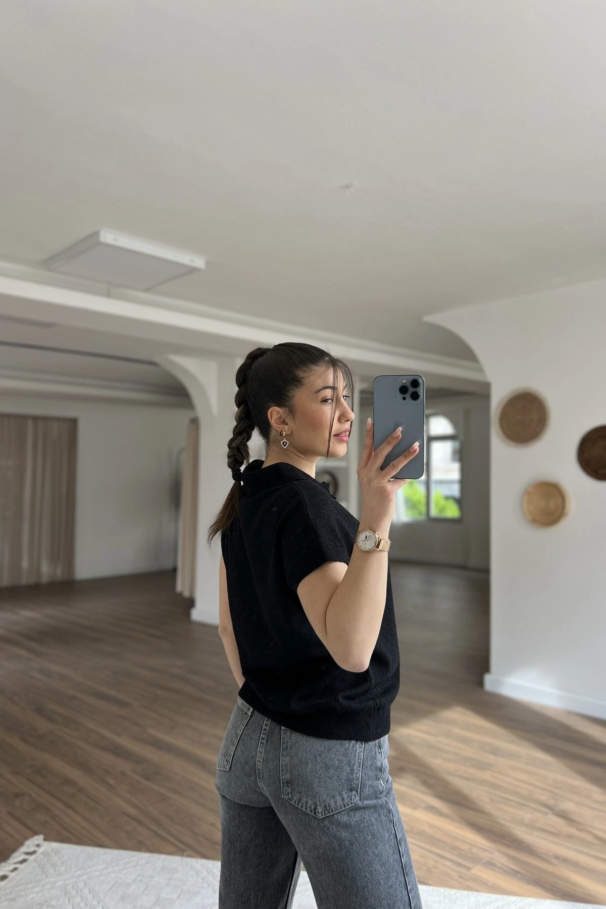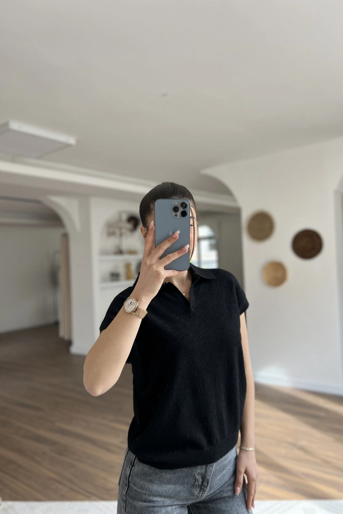 POLO YAKA DÜŞÜK KOL PAMUK İNCE TRİKO BLUZ – SİYAH