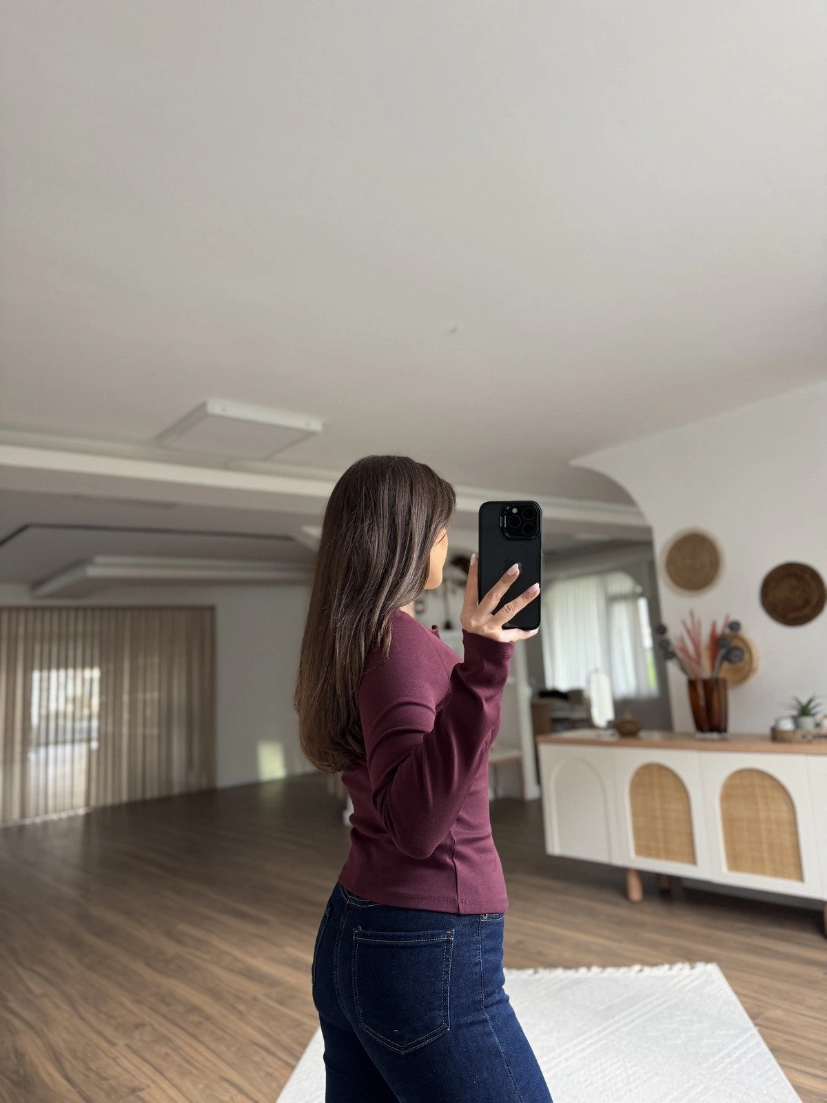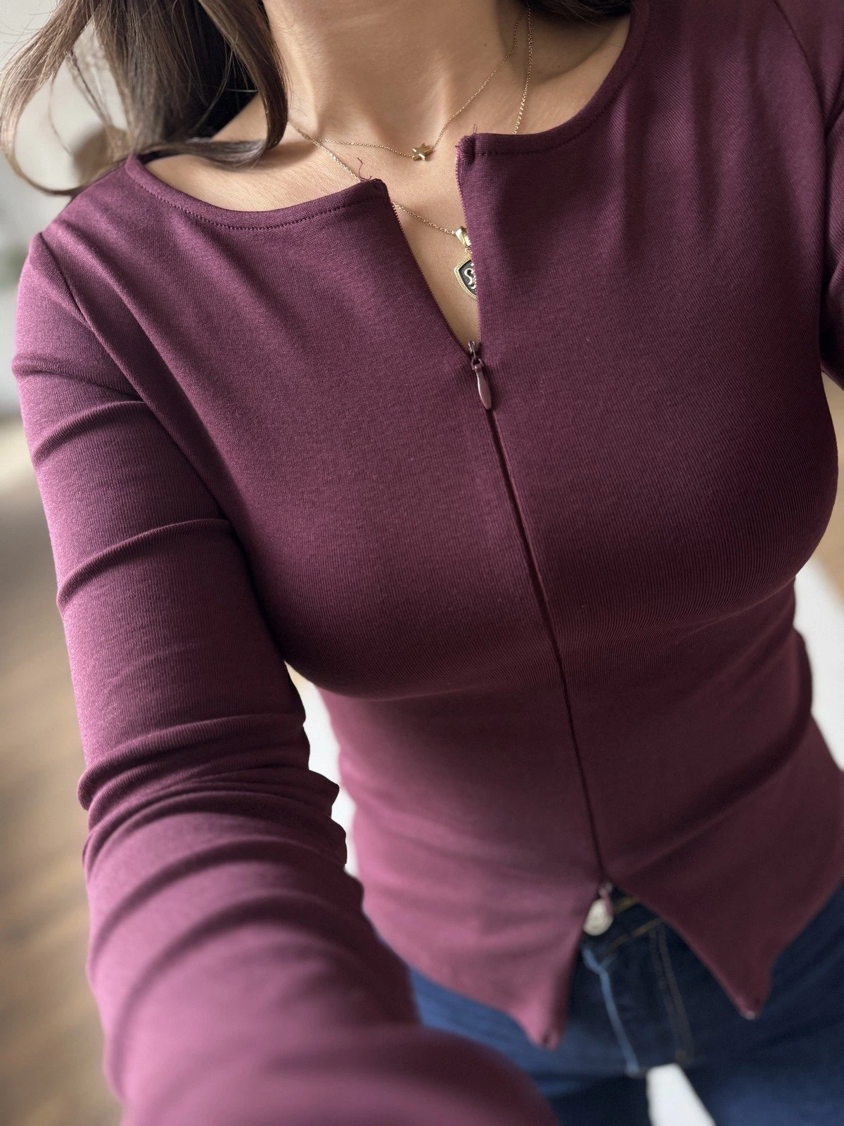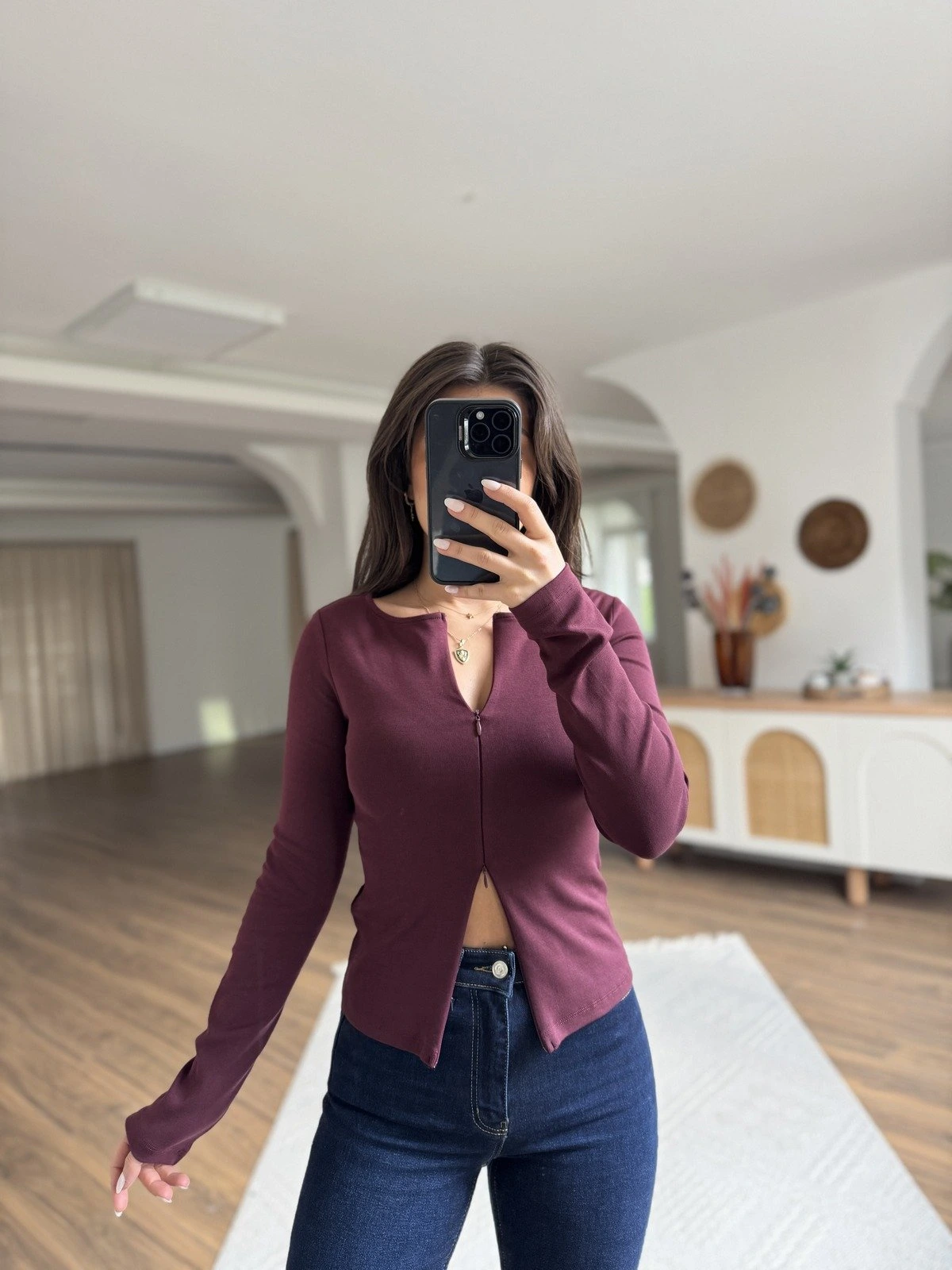 TAM FERMUAR UZUN KOL PAMUK LİKRA BLUZ – BORDO