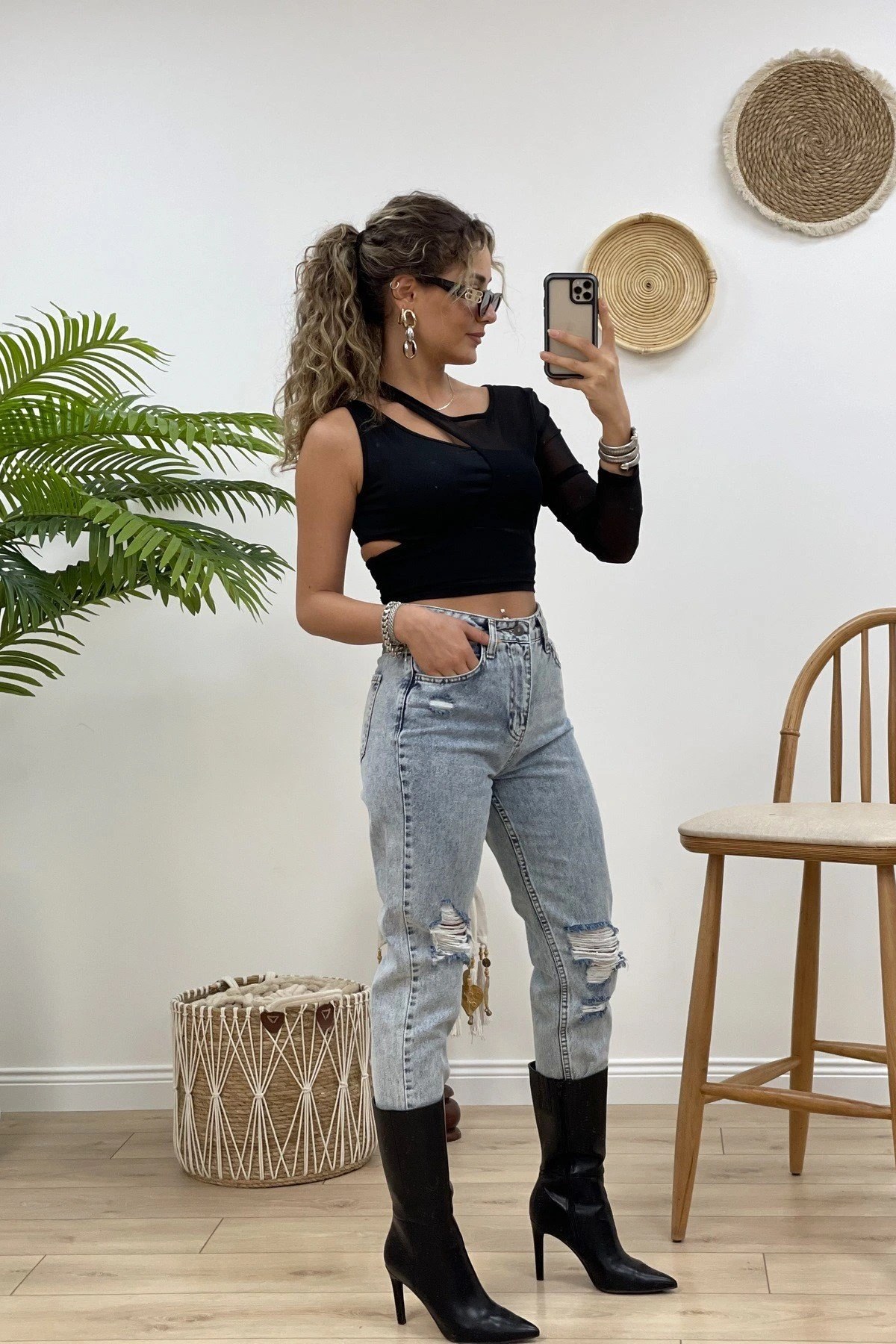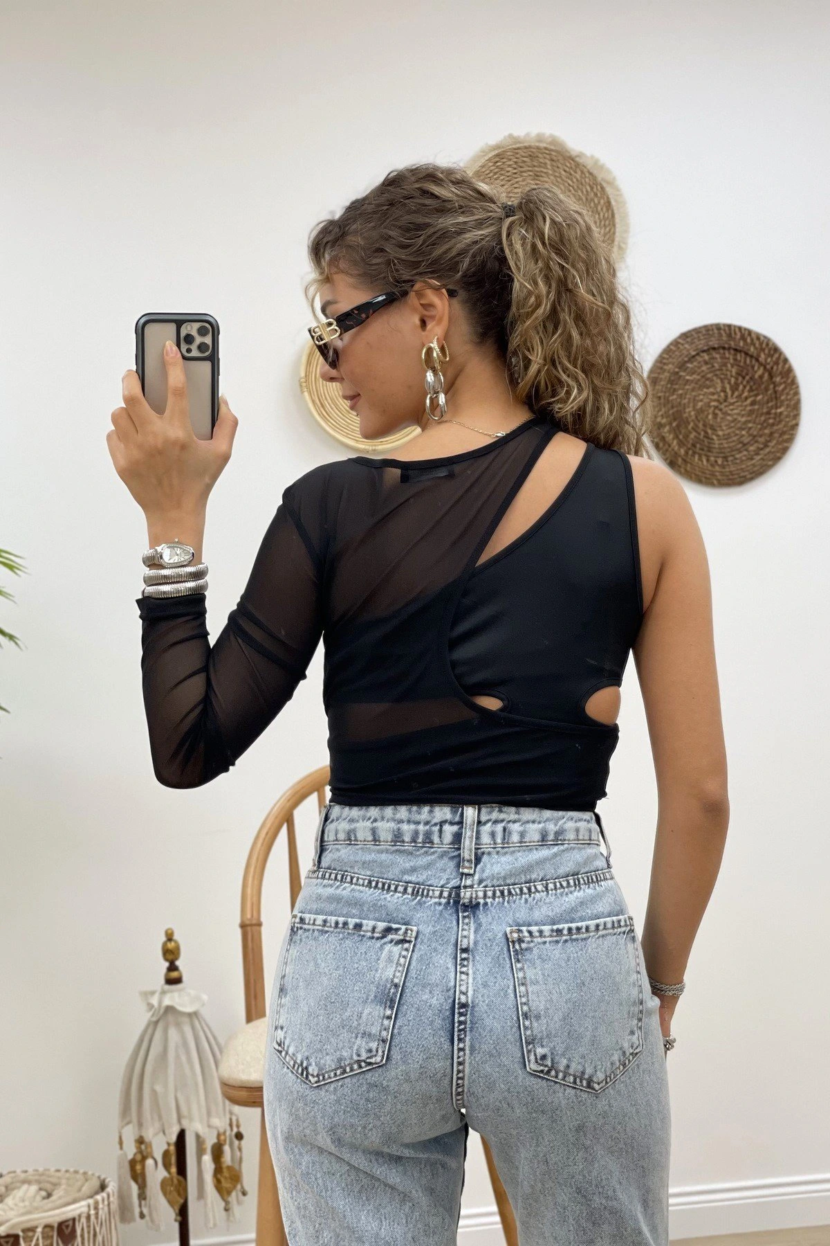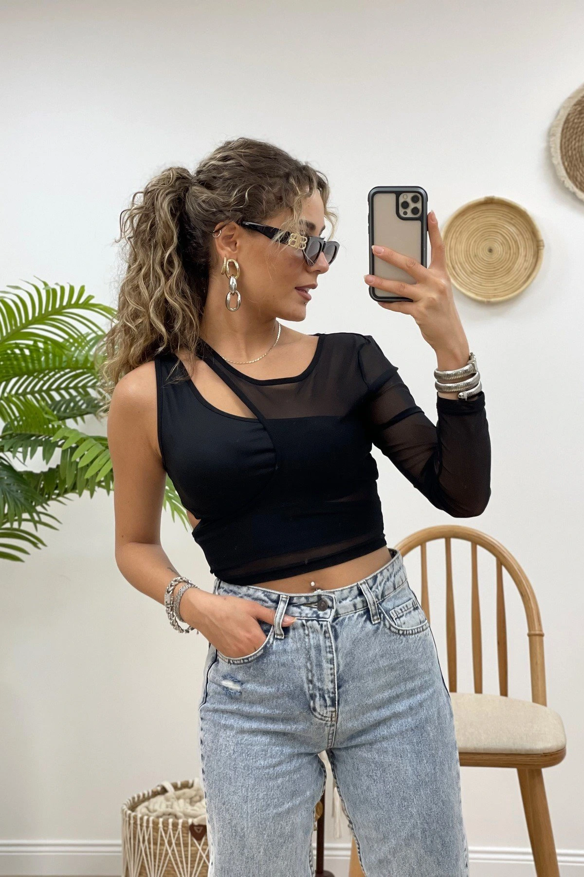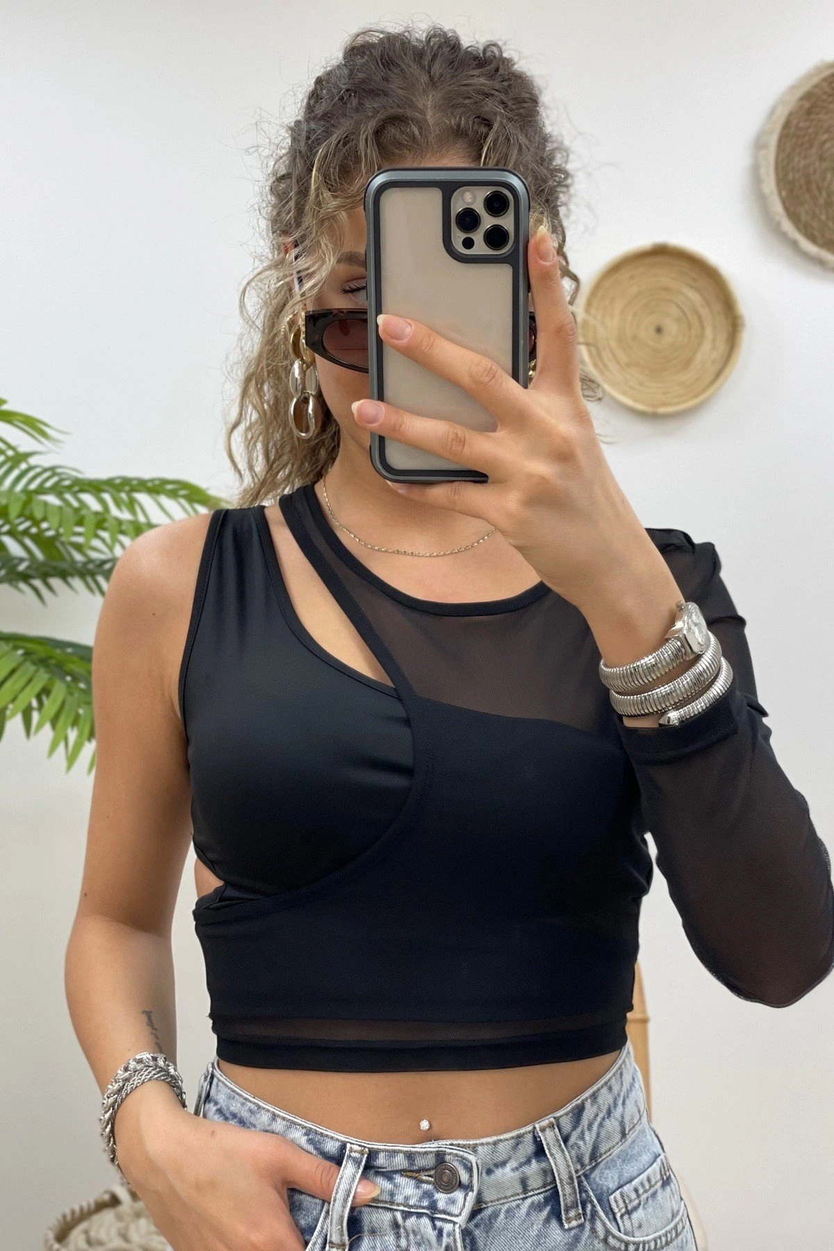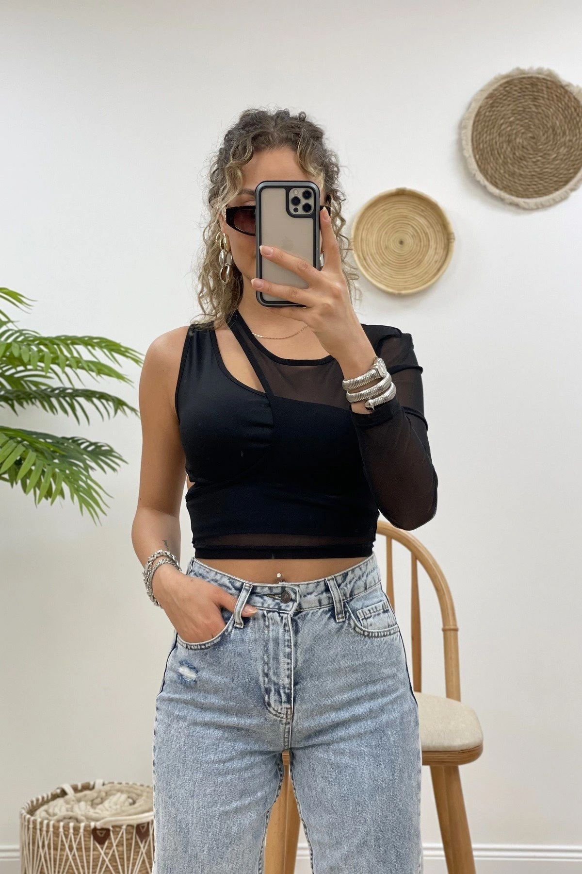 TEK KOL TÜL PARÇALI CROP – SİYAH