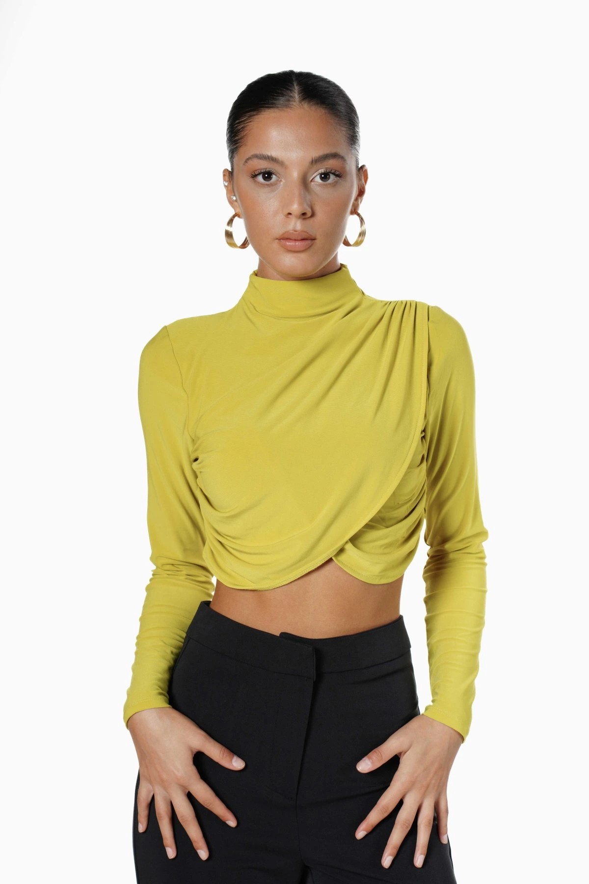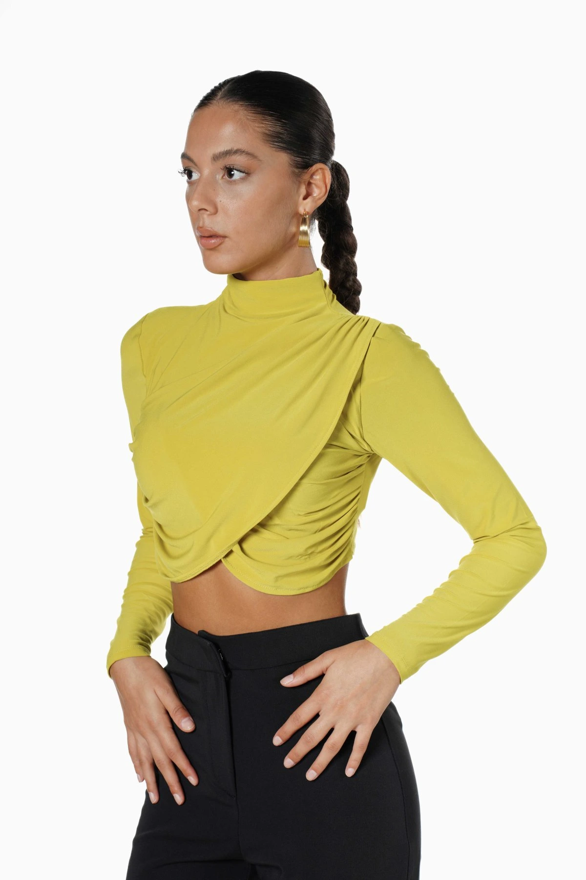YAN BÜZGÜ DİK YAKA ANVELOP CROP BLUZ – OLİVE
