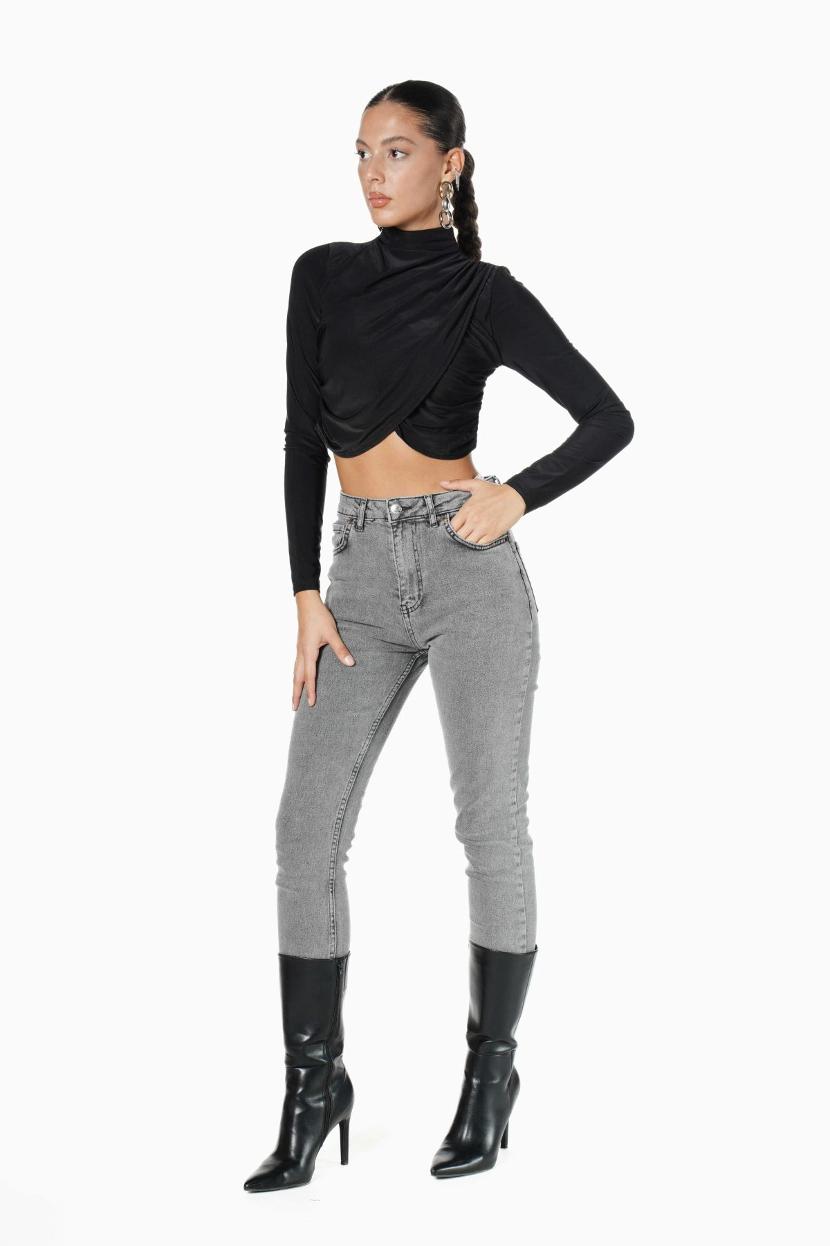 YAN BÜZGÜ DİK YAKA ANVELOP CROP BLUZ – SİYAH