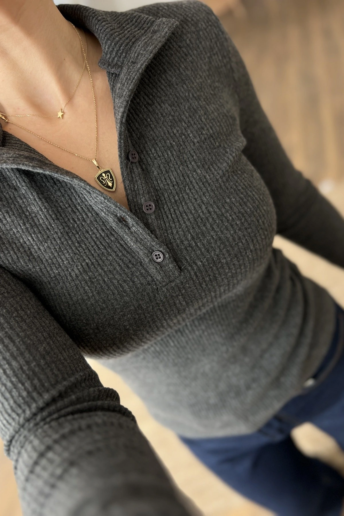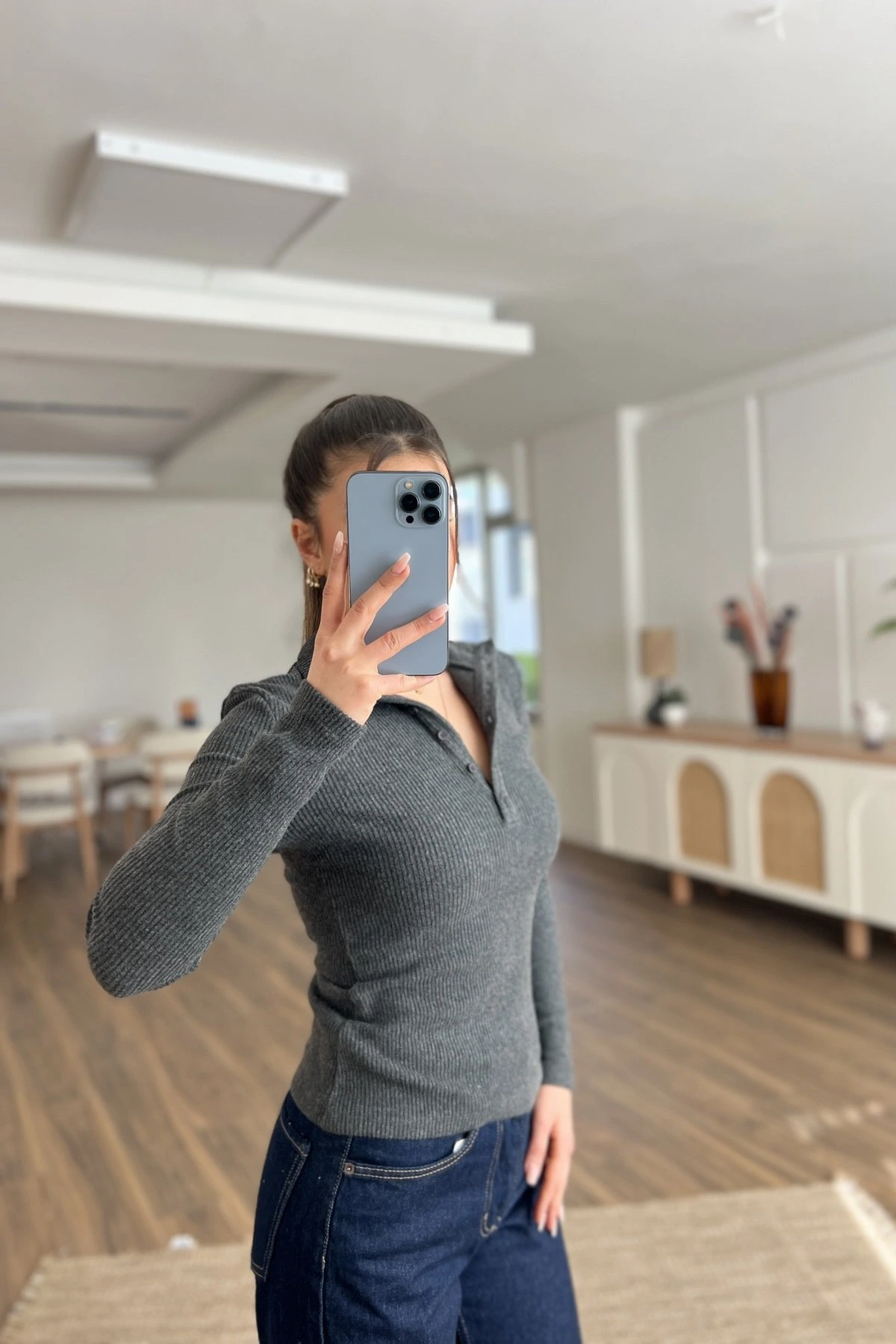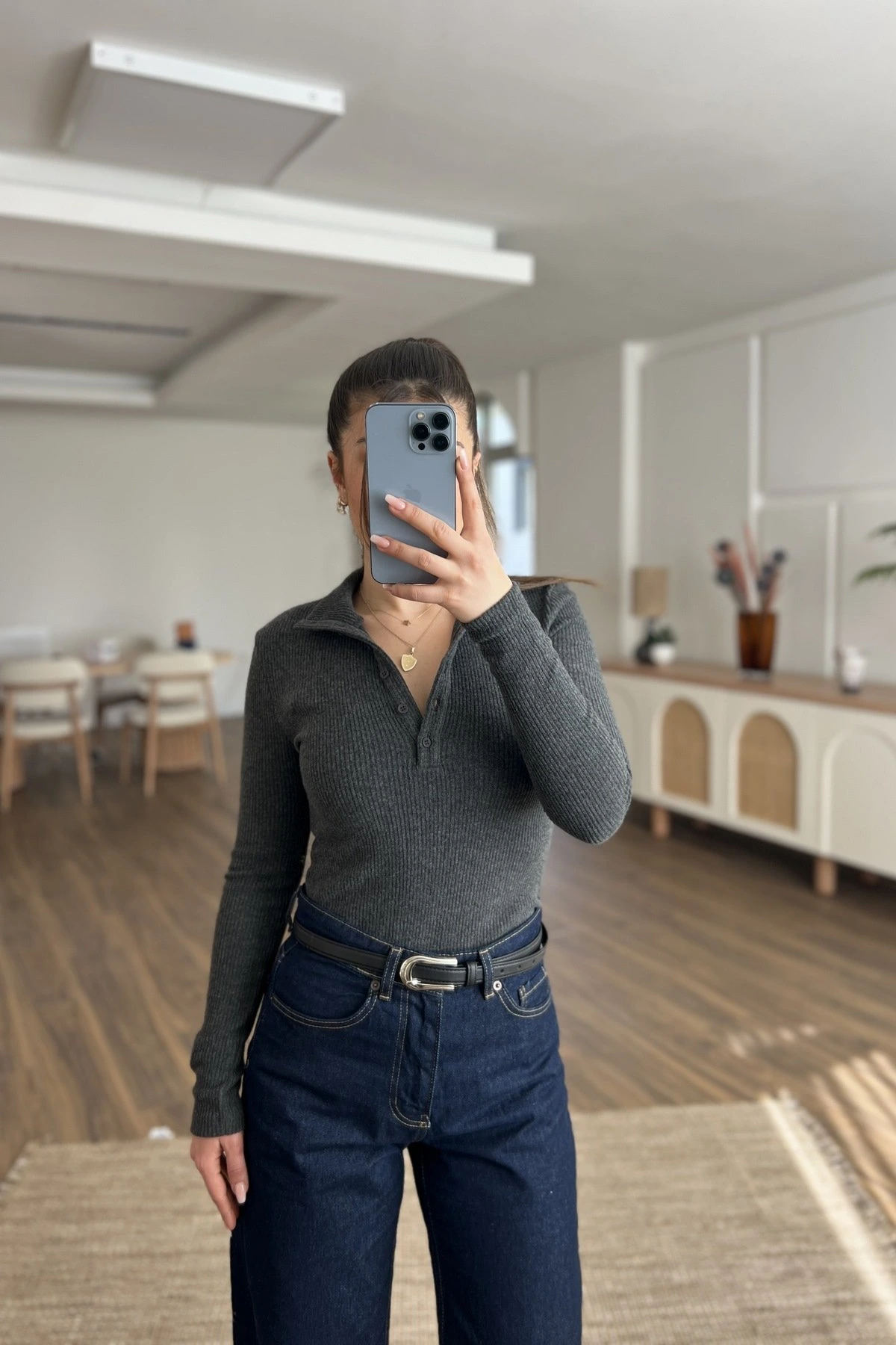 YARI PATLI DİK YAKA VİSKON FİTİLLİ BLUZ – ANTRASİT