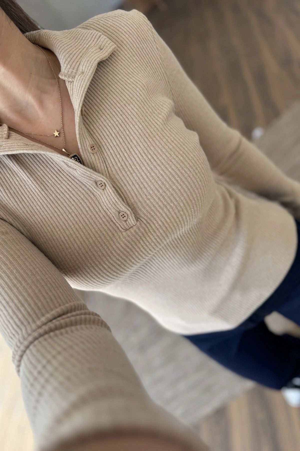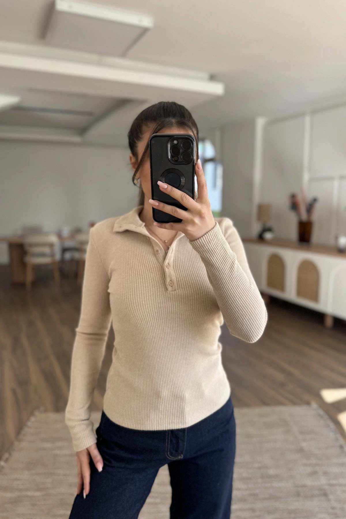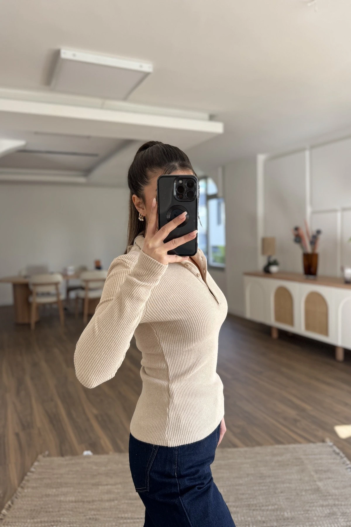 YARI PATLI DİK YAKA VİSKON FİTİLLİ BLUZ – BEJ