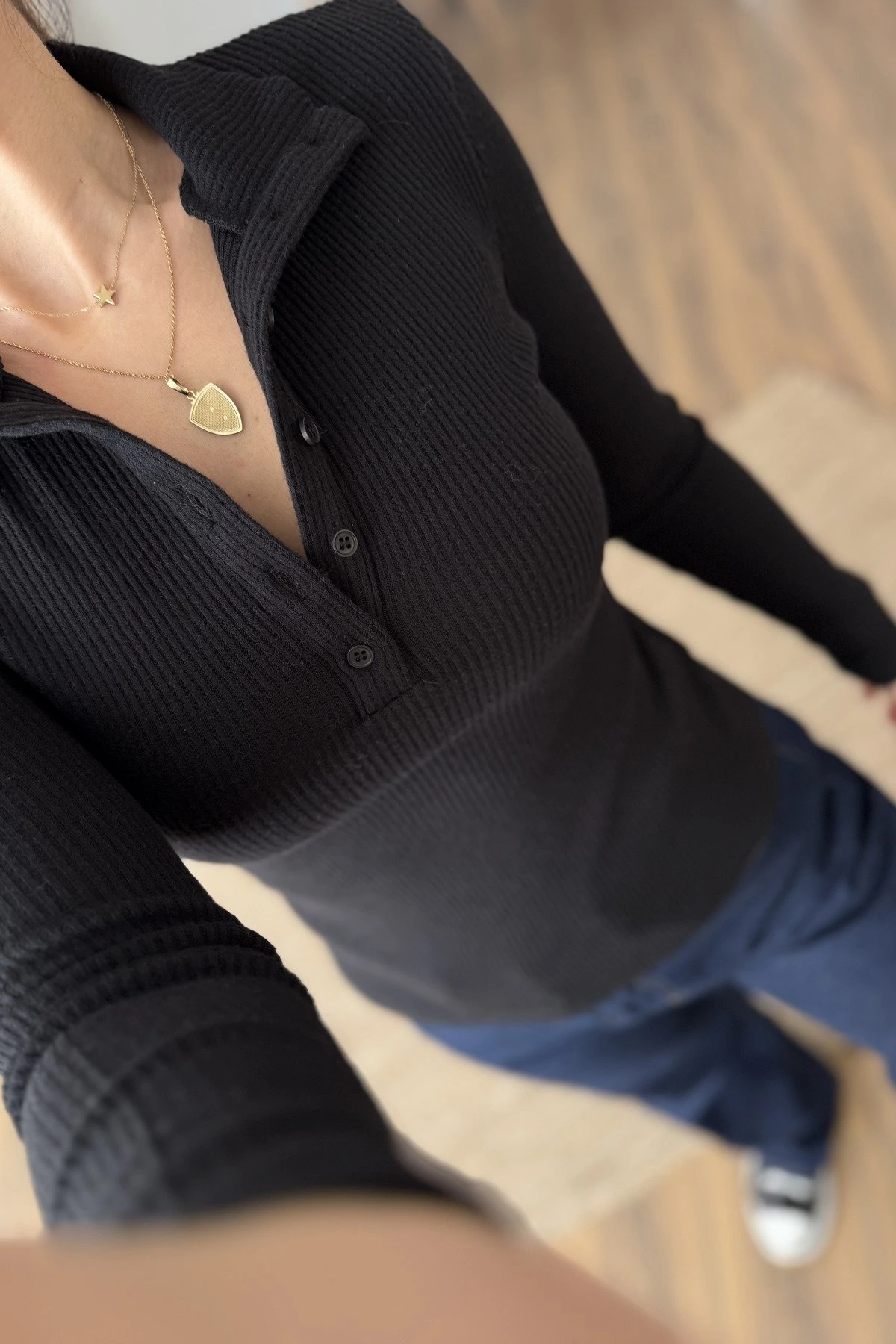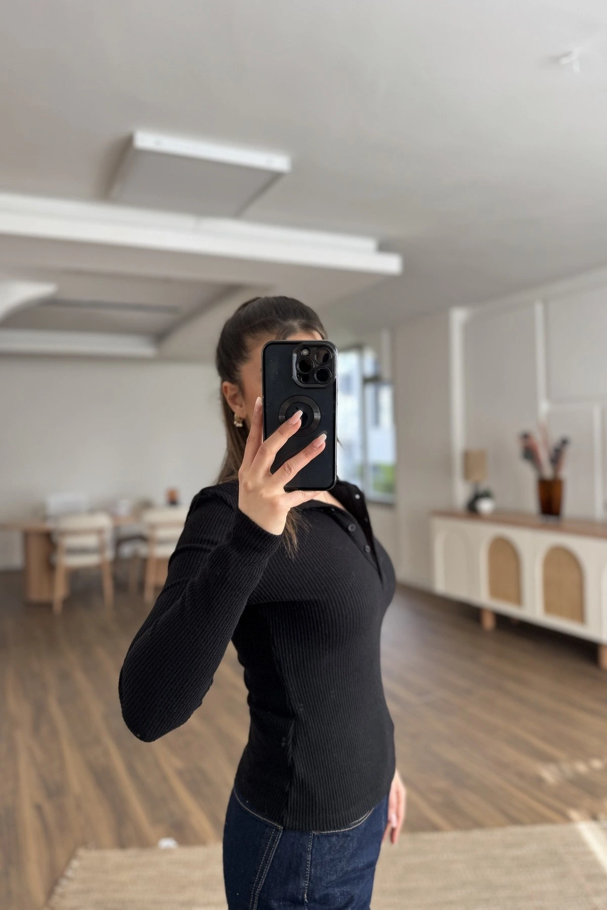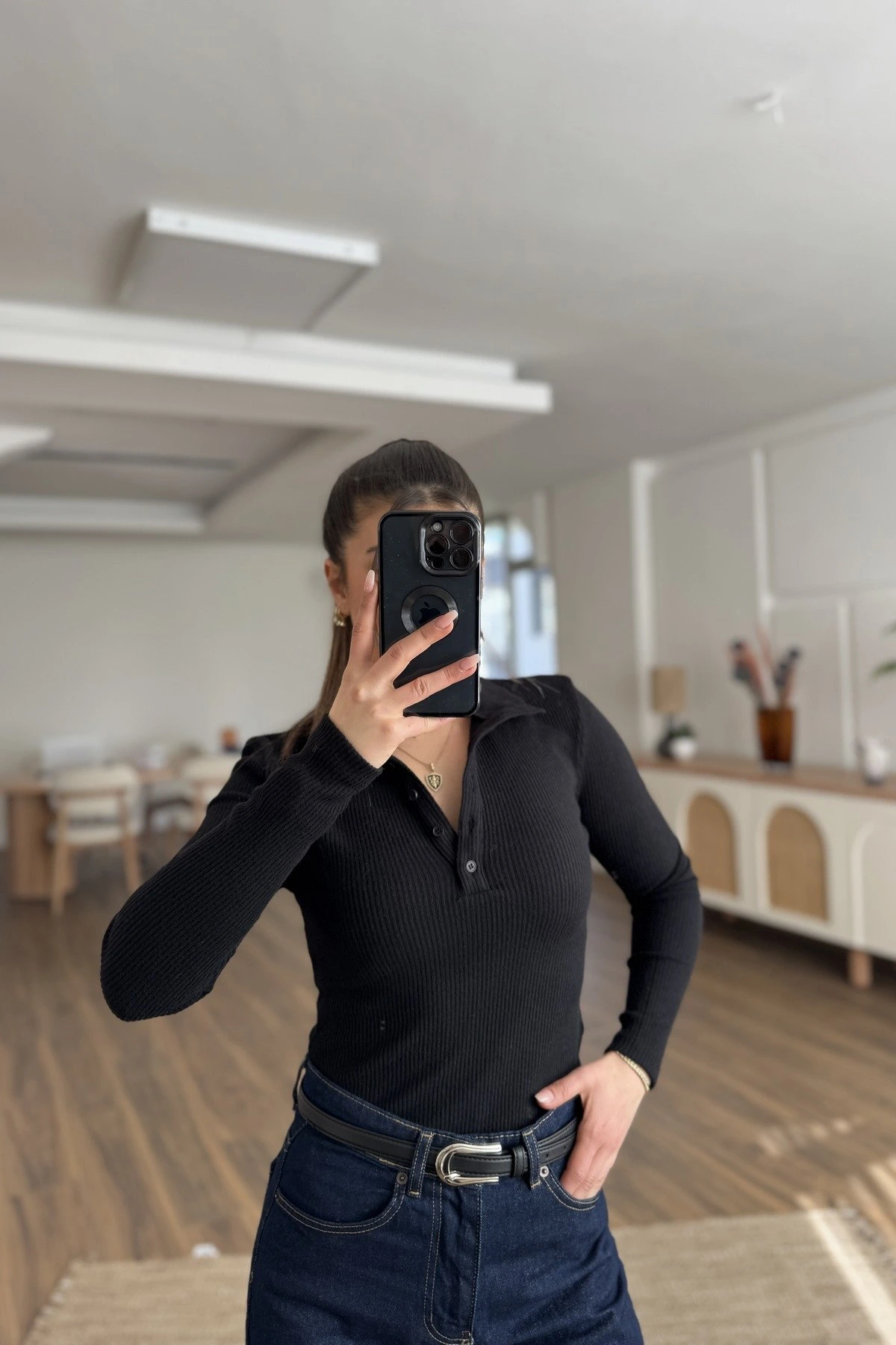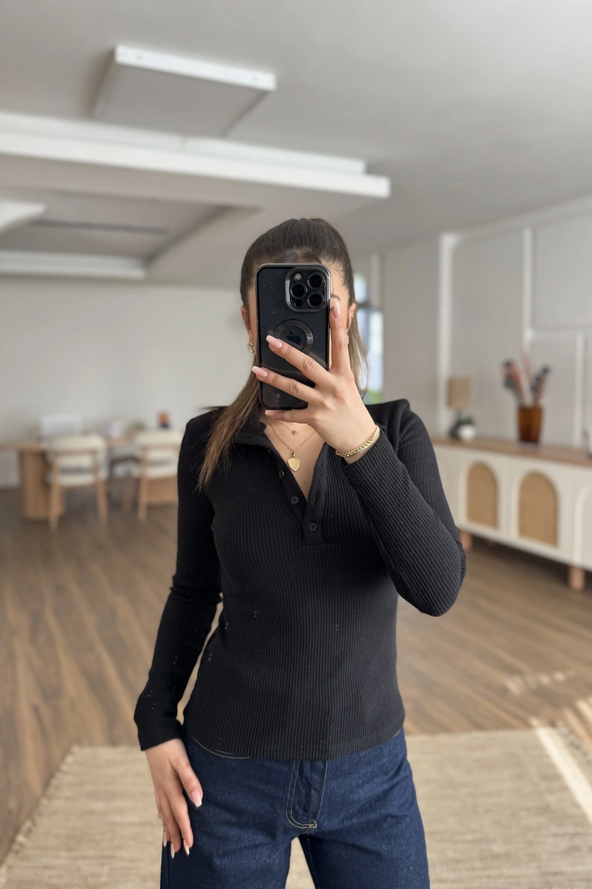 YARI PATLI DİK YAKA VİSKON FİTİLLİ BLUZ – SİYAH