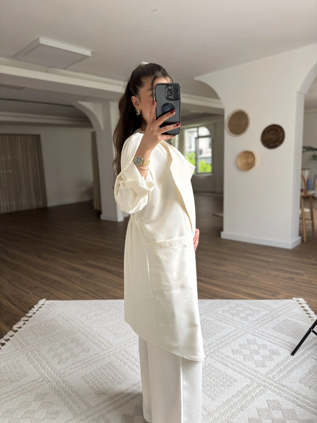 ARKA LASTİK BÜZGÜ TORBA CEP VİSKON KETEN MİDİ CEKET – EKRU