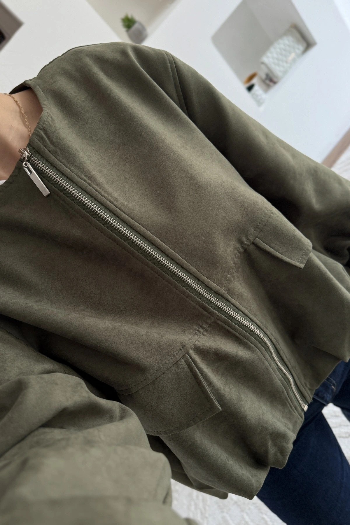 BEL PİLİ KAPAK CEP FERMUARLI SIFIR YAKA SÜET CEKET – HAKİ