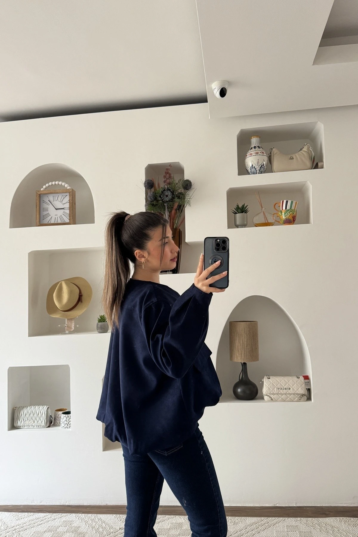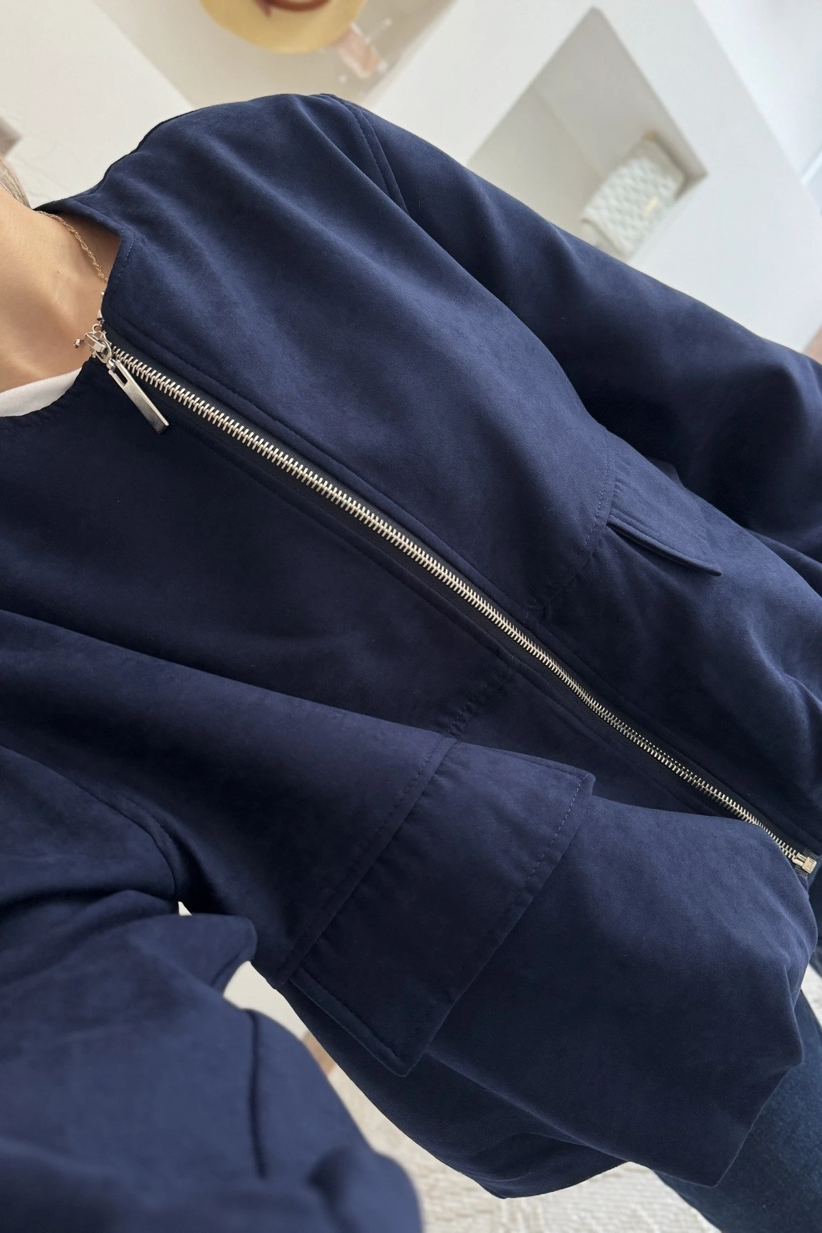 BEL PİLİ KAPAK CEP FERMUARLI SIFIR YAKA SÜET CEKET – LACİVERT