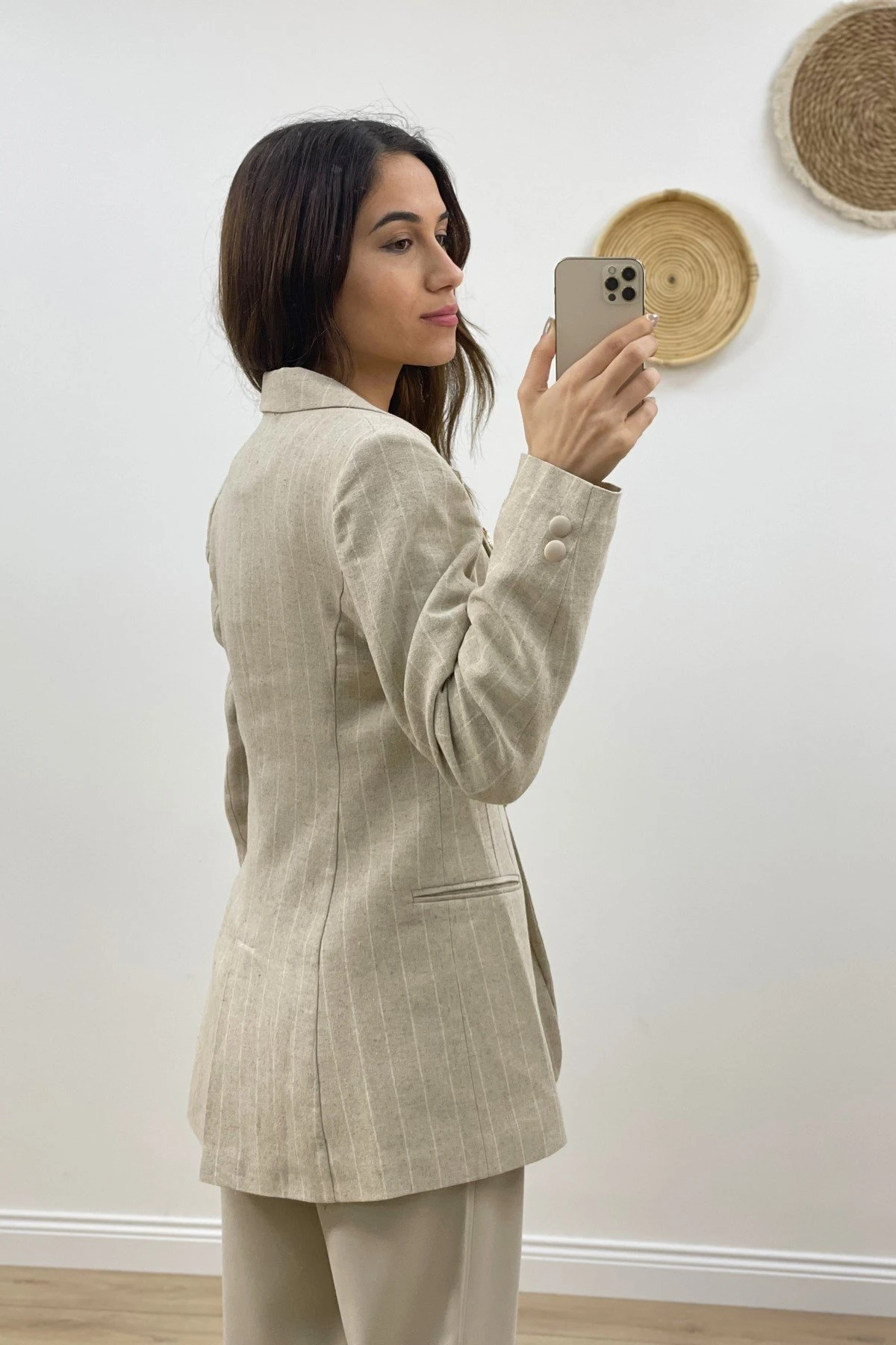 ÇİZGİLİ KETEN TEK DÜĞME CEKET – TAŞ